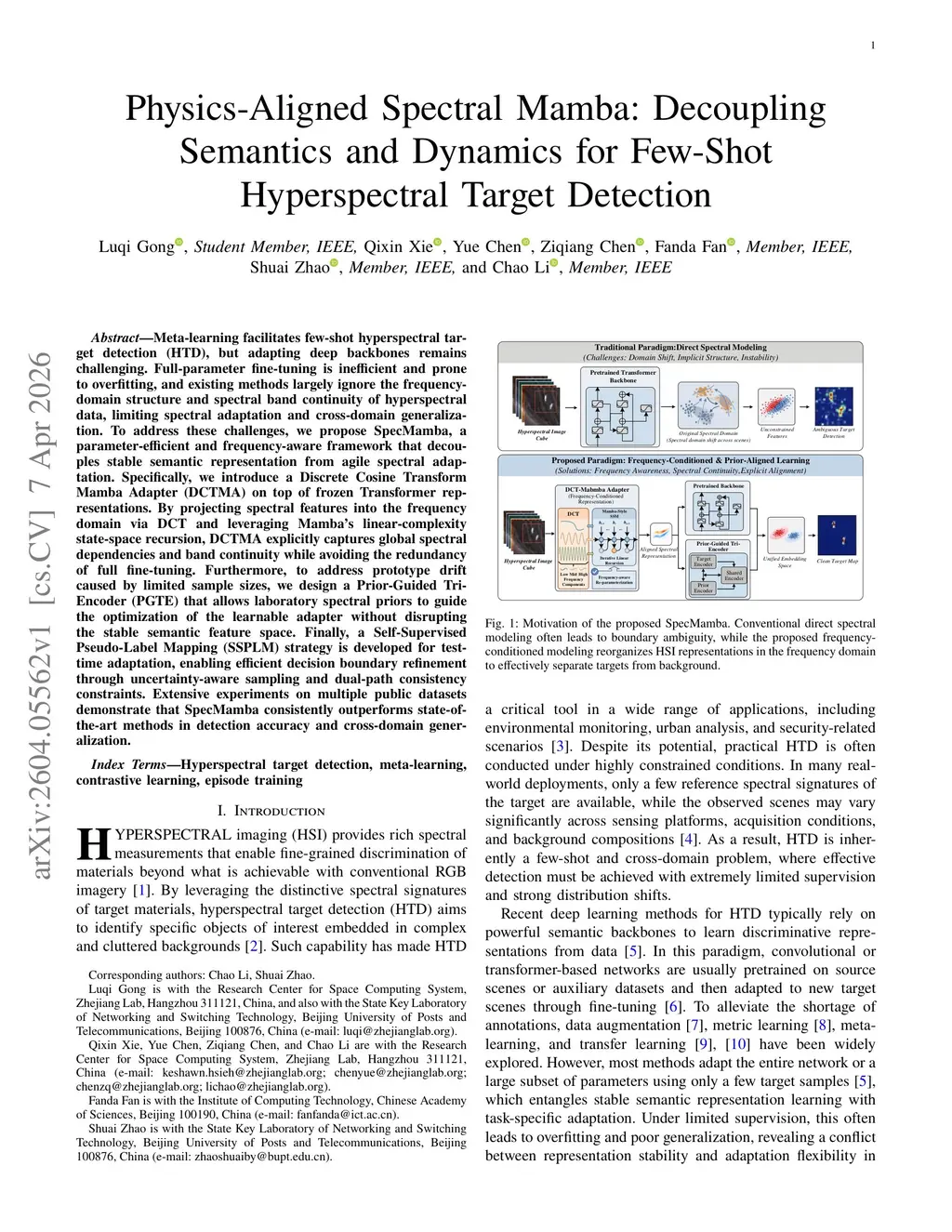 Meta-learning facilitates few-shot hyperspectral target detection (HTD), but adapting deep backbones remains challenging. Full-parameter fine-tuning is inefficient and prone to overfitting, and existing methods largely ignore the frequency-domain structure and spectral band continuity of hyperspectral data, limiting spectral adaptation and cross-domainthis http URLaddress these challenges, we propose SpecMamba, a parameter-efficient and frequency-aware framework that decouples stable semantic representation from agile spectral adaptation. Specifically, we introduce a Discrete Cosine Transform Mamba Adapter (DCTMA) on top of frozen Transformer representations. By projecting spectral features into the frequency domain via DCT and leveraging Mamba's linear-complexity state-space recursion, DCTMA explicitly captures global spectral dependencies and band continuity while avoiding the redundancy of full fine-tuning. Furthermore, to address prototype drift caused by limited sample sizes, we design a Prior-Guided Tri-Encoder (PGTE) that allows laboratory spectral priors to guide the optimization of the learnable adapter without disrupting the stable semantic feature space. Finally, a Self-Supervised Pseudo-Label Mapping (SSPLM) strategy is developed for test-time adaptation, enabling efficient decision boundary refinement through uncertainty-aware sampling and dual-path consistency constraints. Extensive experiments on multiple public datasets demonstrate that SpecMamba consistently outperforms state-of-the-art methods in detection accuracy and cross-domain generalization.
