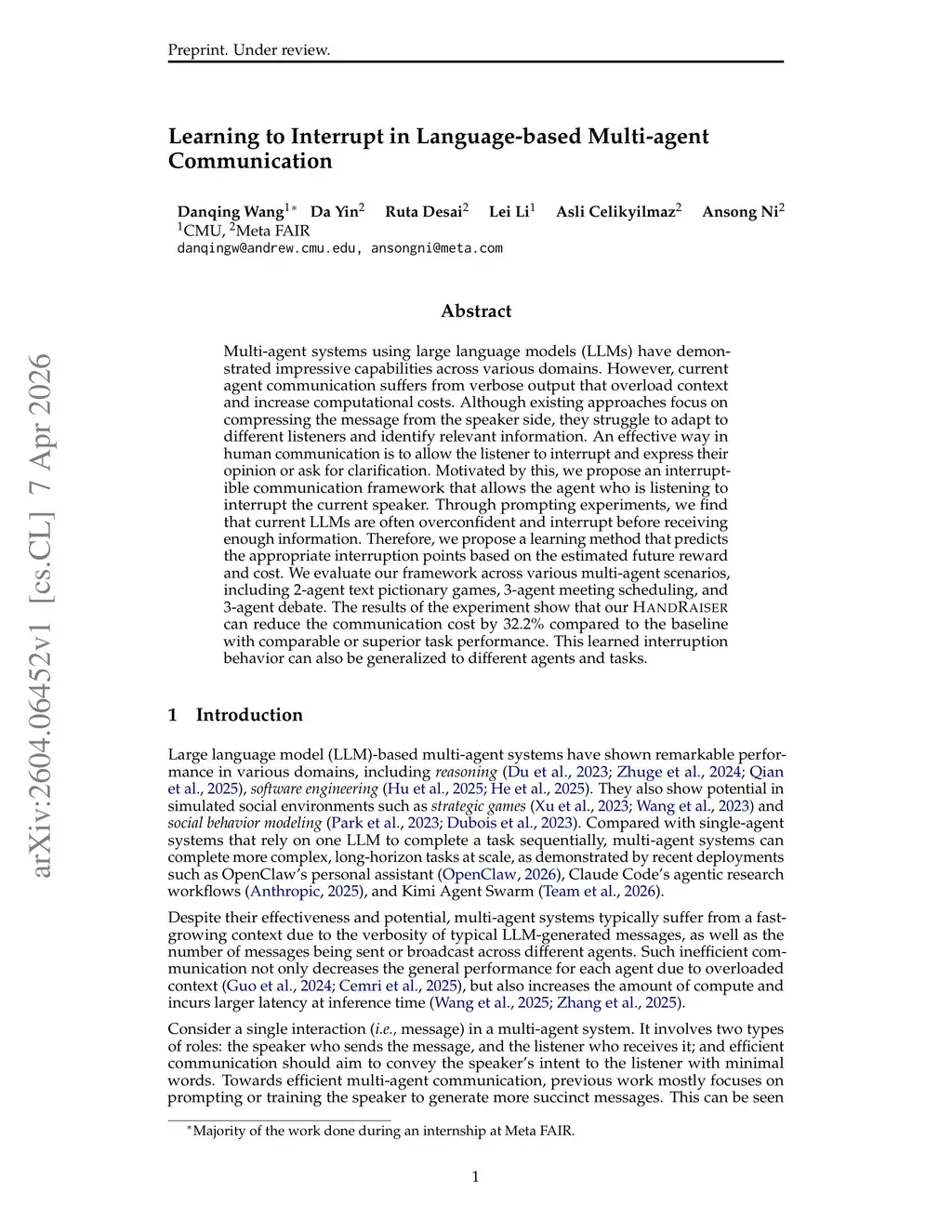 Multi-agent systems using large language models (LLMs) have demonstrated impressive capabilities across various domains. However, current agent communication suffers from verbose output that overload context and increase computational costs. Although existing approaches focus on compressing the message from the speaker side, they struggle to adapt to different listeners and identify relevant information. An effective way in human communication is to allow the listener to interrupt and express their opinion or ask for clarification. Motivated by this, we propose an interruptible communication framework that allows the agent who is listening to interrupt the current speaker. Through prompting experiments, we find that current LLMs are often overconfident and interrupt before receiving enough information. Therefore, we propose a learning method that predicts the appropriate interruption points based on the estimated future reward and cost. We evaluate our framework across various multi-agent scenarios, including 2-agent text pictionary games, 3-agent meeting scheduling, and 3-agent debate. The results of the experiment show that our HANDRAISER can reduce the communication cost by 32.2% compared to the baseline with comparable or superior task performance. This learned interruption behavior can also be generalized to different agents and tasks.