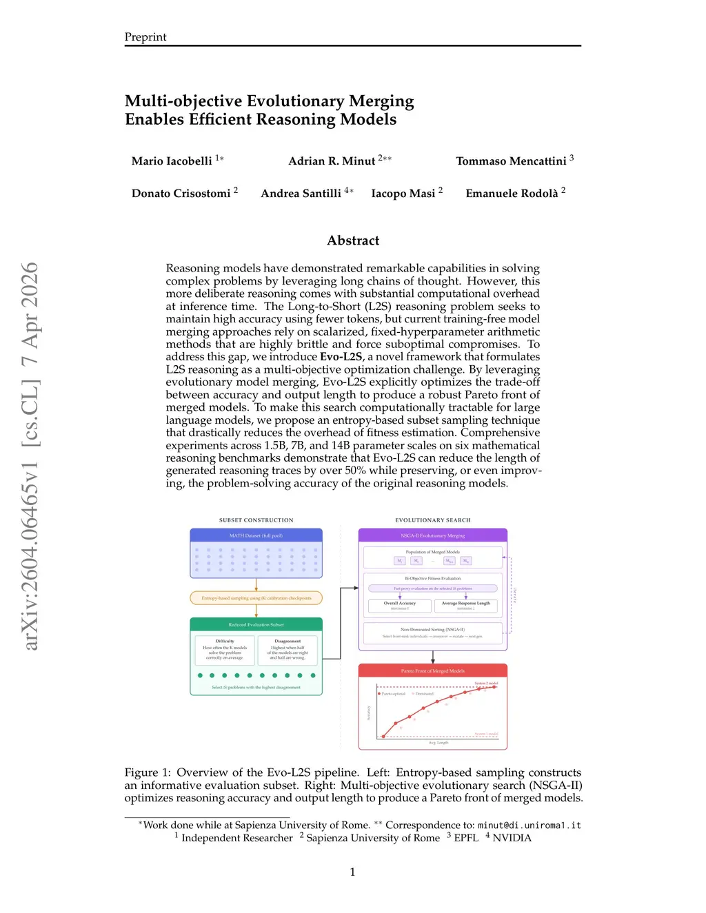 Reasoning models have demonstrated remarkable capabilities in solving complex problems by leveraging long chains of thought. However, this more deliberate reasoning comes with substantial computational overhead at inference time. The Long-to-Short (L2S) reasoning problem seeks to maintain high accuracy using fewer tokens, but current training-free model merging approaches rely on scalarized, fixed-hyperparameter arithmetic methods that are highly brittle and force suboptimal compromises. To address this gap, we introduce Evo-L2S, a novel framework that formulates L2S reasoning as a multi-objective optimization challenge. By leveraging evolutionary model merging, Evo-L2S explicitly optimizes the trade-off between accuracy and output length to produce a robust Pareto front of merged models. To make this search computationally tractable for large language models, we propose an entropy-based subset sampling technique that drastically reduces the overhead of fitness estimation. Comprehensive experiments across 1.5B, 7B, and 14B parameter scales on six mathematical reasoning benchmarks demonstrate that Evo-L2S can reduce the length of generated reasoning traces by over 50% while preserving, or even improving, the problem-solving accuracy of the original reasoning models.