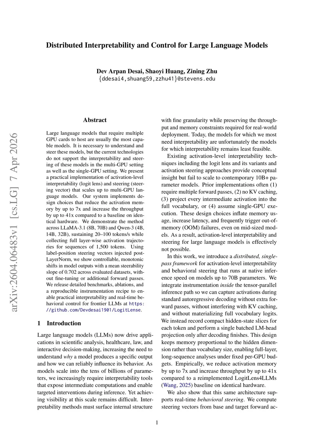 Large language models that require multiple GPU cards to host are usually the most capable models. It is necessary to understand and steer these models, but the current technologies do not support the interpretability and steering of these models in the multi-GPU setting as well as the single-GPU setting. We present a practical implementation of activation-level interpretability (logit lens) and steering (steering vector) that scales up to multi-GPU language models. Our system implements design choices that reduce the activation memory by up to 7x and increase the throughput by up to 41x compared to a baseline on identical hardware. We demonstrate the method across LLaMA-3.1 (8B, 70B) and Qwen-3 (4B, 14B, 32B), sustaining 20-100 tokens/s while collecting full layer-wise activation trajectories for sequences of 1,500 tokens. Using label-position steering vectors injected post-LayerNorm, we show controllable, monotonic shifts in model outputs with a mean steerability slope of 0.702 across evaluated datasets, without fine-tuning or additional forward passes. We release detailed benchmarks, ablations, and a reproducible instrumentation recipe to enable practical interpretability and real-time behavioral control for frontier LLMs atthis https URL.
