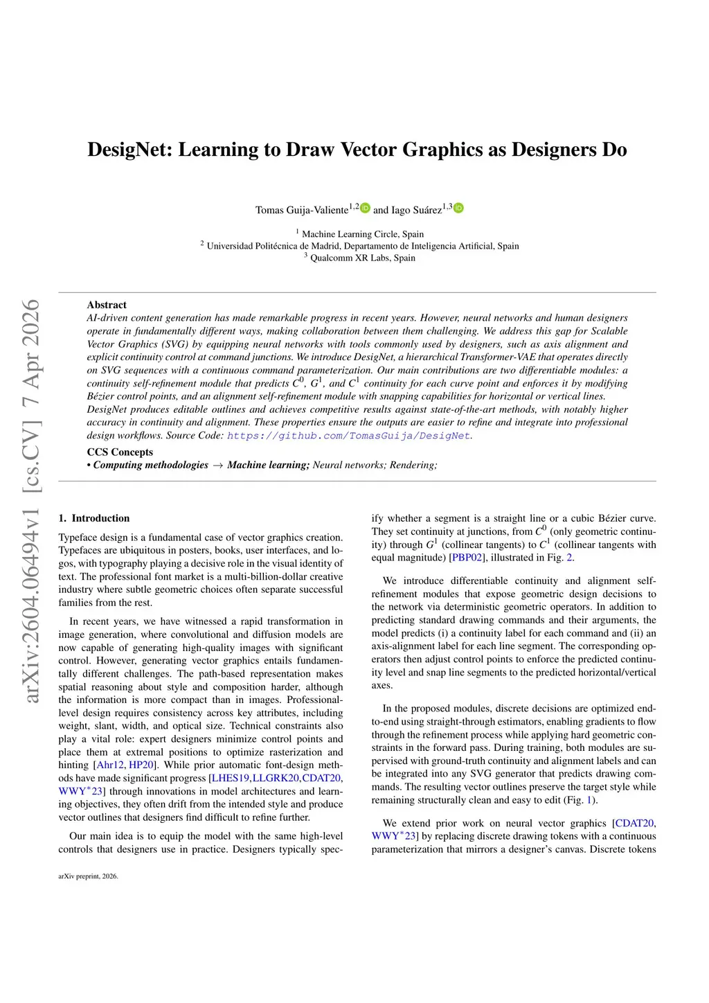 AI-driven content generation has made remarkable progress in recent years. However, neural networks and human designers operate in fundamentally different ways, making collaboration between them challenging. We address this gap for Scalable Vector Graphics (SVG) by equipping neural networks with tools commonly used by designers, such as axis alignment and explicit continuity control at command junctions. We introduce DesigNet, a hierarchical Transformer-VAE that operates directly on SVG sequences with a continuous command parameterization. Our main contributions are two differentiable modules: a continuity self-refinement module that predicts , , and continuity for each curve point and enforces it by modifying Bézier control points, and an alignment self-refinement module with snapping capabilities for horizontal or vertical lines. DesigNet produces editable outlines and achieves competitive results against state-of-the-art methods, with notably higher accuracy in continuity and alignment. These properties ensure the outputs are easier to refine and integrate into professional design workflows. Source Code:this https URL.