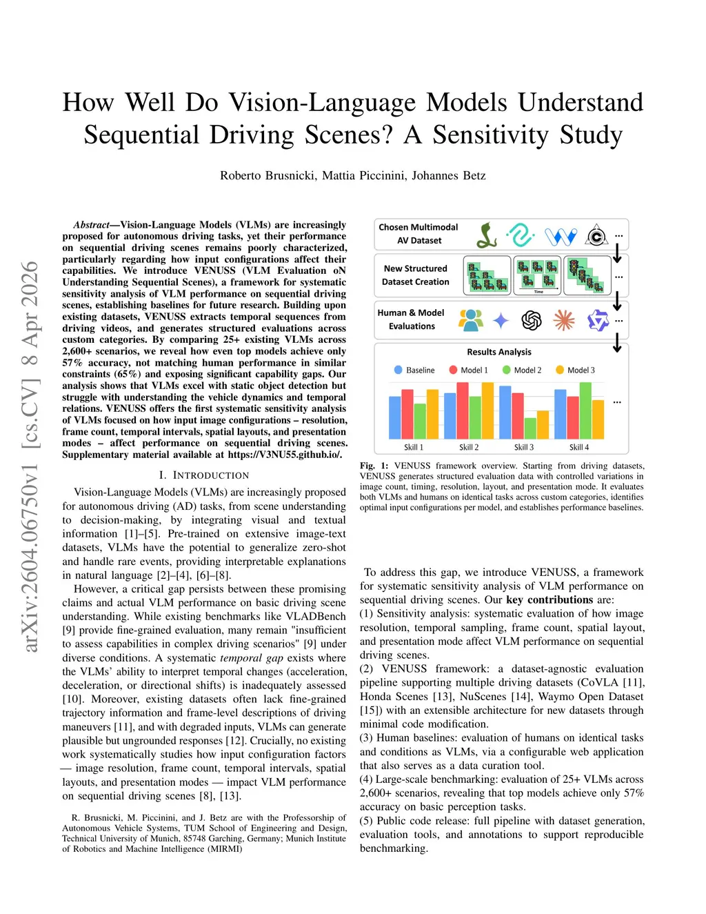Vision-Language Models (VLMs) are increasingly proposed for autonomous driving tasks, yet their performance on sequential driving scenes remains poorly characterized, particularly regarding how input configurations affect their capabilities. We introduce VENUSS (VLM Evaluation oN Understanding Sequential Scenes), a framework for systematic sensitivity analysis of VLM performance on sequential driving scenes, establishing baselines for future research. Building upon existing datasets, VENUSS extracts temporal sequences from driving videos, and generates structured evaluations across custom categories. By comparing 25+ existing VLMs across 2,600+ scenarios, we reveal how even top models achieve only 57% accuracy, not matching human performance in similar constraints (65%) and exposing significant capability gaps. Our analysis shows that VLMs excel with static object detection but struggle with understanding the vehicle dynamics and temporal relations. VENUSS offers the first systematic sensitivity analysis of VLMs focused on how input image configurations - resolution, frame count, temporal intervals, spatial layouts, and presentation modes - affect performance on sequential driving scenes. Supplementary material available atthis https URL