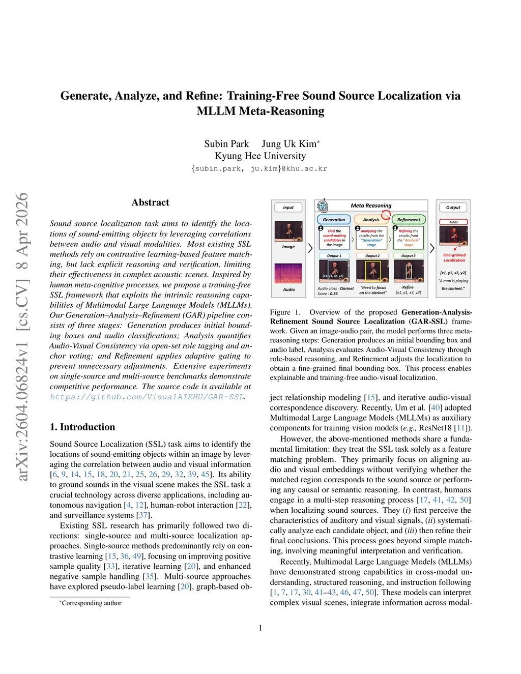 Sound source localization task aims to identify the locations of sound-emitting objects by leveraging correlations between audio and visual modalities. Most existing SSL methods rely on contrastive learning-based feature matching, but lack explicit reasoning and verification, limiting their effectiveness in complex acoustic scenes. Inspired by human meta-cognitive processes, we propose a training-free SSL framework that exploits the intrinsic reasoning capabilities of Multimodal Large Language Models (MLLMs). Our Generation-Analysis-Refinement (GAR) pipeline consists of three stages: Generation produces initial bounding boxes and audio classifications; Analysis quantifies Audio-Visual Consistency via open-set role tagging and anchor voting; and Refinement applies adaptive gating to prevent unnecessary adjustments. Extensive experiments on single-source and multi-source benchmarks demonstrate competitive performance. The source code is available atthis https URL.