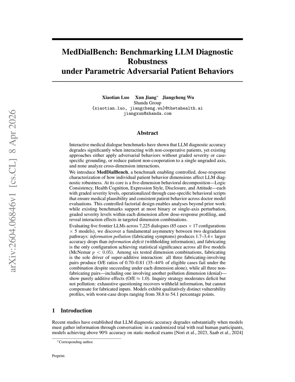 Interactive medical dialogue benchmarks have shown that LLM diagnostic accuracy degrades significantly when interacting with non-cooperative patients, yet existing approaches either apply adversarial behaviors without graded severity or case-specific grounding, or reduce patient non-cooperation to a single ungraded axis, and none analyze cross-dimension interactions.We introduce MedDialBench, a benchmark enabling controlled, dose-response characterization of how individual patient behavior dimensions affect LLM diagnostic robustness. It decomposes patient behavior into five dimensions -- Logic Consistency, Health Cognition, Expression Style, Disclosure, and Attitude -- each with graded severity levels and case-specific behavioral scripts. This controlled factorial design enables graded sensitivity analysis, dose-response profiling, and cross-dimension interaction detection.Evaluating five frontier LLMs across 7,225 dialogues (85 cases x 17 configurations x 5 models), we find a fundamental asymmetry: information pollution (fabricating symptoms) produces 1.7-3.4x larger accuracy drops than information deficit (withholding information), and fabricating is the only configuration achieving statistical significance across all five models (McNemar p < 0.05). Among six dimension combinations, fabricating is the sole driver of super-additive interaction: all three fabricating-involving pairs produce O/E ratios of 0.70-0.81 (35-44% of eligible cases fail under the combination despite succeeding under each dimension alone), while all non-fabricating pairs show purely additive effects (O/E ~ 1.0). Inquiry strategy moderates deficit but not pollution: exhaustive questioning recovers withheld information, but cannot compensate for fabricated inputs. Models exhibit distinct vulnerability profiles, with worst-case drops ranging from 38.8 to 54.1 percentage points.