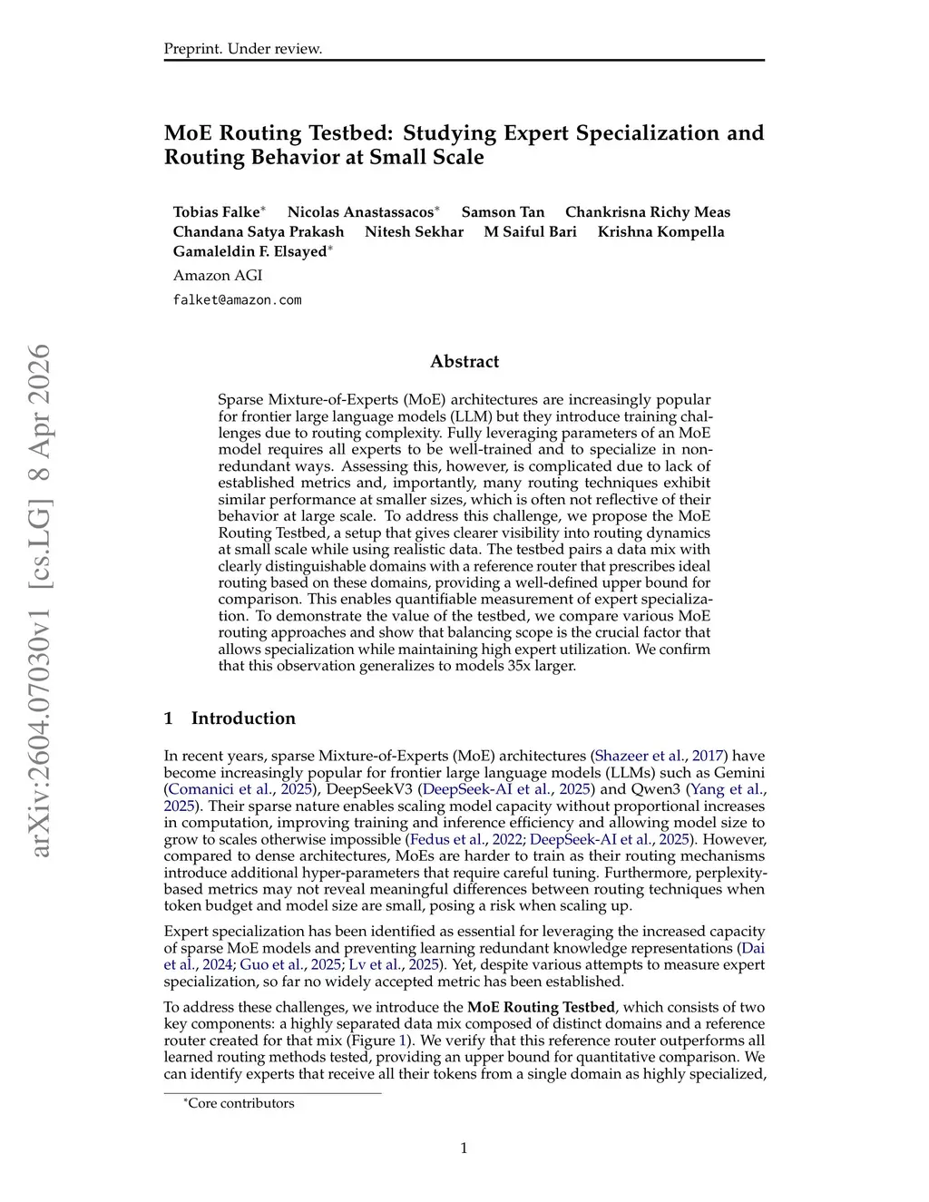 Sparse Mixture-of-Experts (MoE) architectures are increasingly popular for frontier large language models (LLM) but they introduce training challenges due to routing complexity. Fully leveraging parameters of an MoE model requires all experts to be well-trained and to specialize in non-redundant ways. Assessing this, however, is complicated due to lack of established metrics and, importantly, many routing techniques exhibit similar performance at smaller sizes, which is often not reflective of their behavior at large scale. To address this challenge, we propose the MoE Routing Testbed, a setup that gives clearer visibility into routing dynamics at small scale while using realistic data. The testbed pairs a data mix with clearly distinguishable domains with a reference router that prescribes ideal routing based on these domains, providing a well-defined upper bound for comparison. This enables quantifiable measurement of expert specialization. To demonstrate the value of the testbed, we compare various MoE routing approaches and show that balancing scope is the crucial factor that allows specialization while maintaining high expert utilization. We confirm that this observation generalizes to models 35x larger.