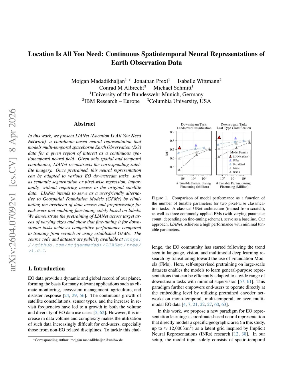 In this work, we present LIANet (Location Is All You Need Network), a coordinate-based neural representation that models multi-temporal spaceborne Earth observation (EO) data for a given region of interest as a continuous spatiotemporal neural field. Given only spatial and temporal coordinates, LIANet reconstructs the corresponding satellite imagery. Once pretrained, this neural representation can be adapted to various EO downstream tasks, such as semantic segmentation or pixel-wise regression, importantly, without requiring access to the original satellite data. LIANet intends to serve as a user-friendly alternative to Geospatial Foundation Models (GFMs) by eliminating the overhead of data access and preprocessing for end-users and enabling fine-tuning solely based on labels. We demonstrate the pretraining of LIANet across target areas of varying sizes and show that fine-tuning it for downstream tasks achieves competitive performance compared to training from scratch or using established GFMs. The source code and datasets are publicly available atthis https URL.