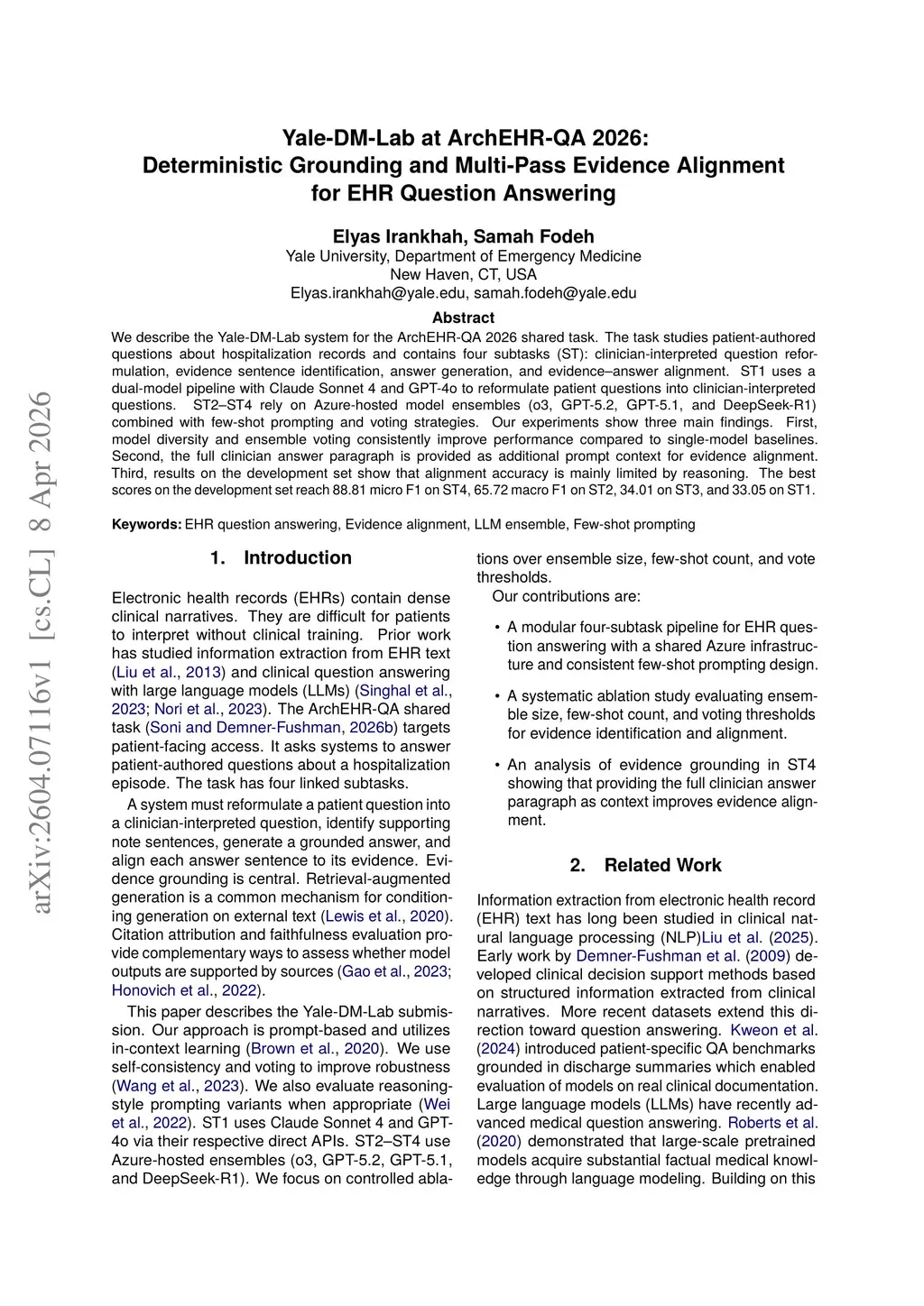 We describe the Yale-DM-Lab system for the ArchEHR-QA 2026 shared task. The task studies patient-authored questions about hospitalization records and contains four subtasks (ST): clinician-interpreted question reformulation, evidence sentence identification, answer generation, and evidence-answer alignment. ST1 uses a dual-model pipeline with Claude Sonnet 4 and GPT-4o to reformulate patient questions into clinician-interpreted questions. ST2-ST4 rely on Azure-hosted model ensembles (o3, GPT-5.2, GPT-5.1, and DeepSeek-R1) combined with few-shot prompting and voting strategies. Our experiments show three main findings. First, model diversity and ensemble voting consistently improve performance compared to single-model baselines. Second, the full clinician answer paragraph is provided as additional prompt context for evidence alignment. Third, results on the development set show that alignment accuracy is mainly limited by reasoning. The best scores on the development set reach 88.81 micro F1 on ST4, 65.72 macro F1 on ST2, 34.01 on ST3, and 33.05 on ST1.