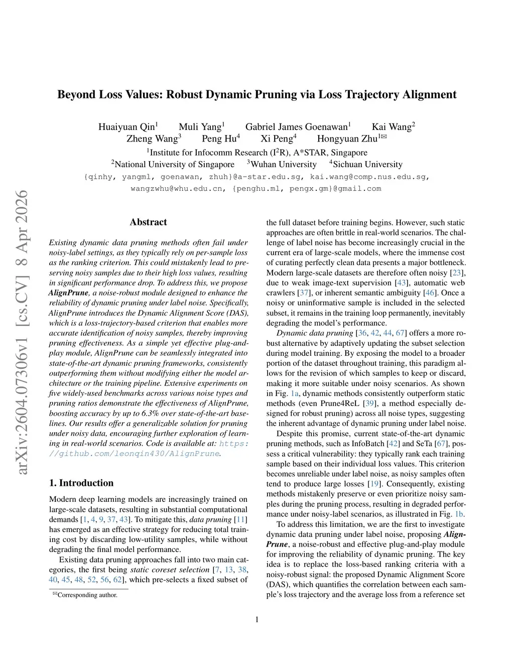 Existing dynamic data pruning methods often fail under noisy-label settings, as they typically rely on per-sample loss as the ranking criterion. This could mistakenly lead to preserving noisy samples due to their high loss values, resulting in significant performance drop. To address this, we propose AlignPrune, a noise-robust module designed to enhance the reliability of dynamic pruning under label noise. Specifically, AlignPrune introduces the Dynamic Alignment Score (DAS), which is a loss-trajectory-based criterion that enables more accurate identification of noisy samples, thereby improving pruning effectiveness. As a simple yet effective plug-and-play module, AlignPrune can be seamlessly integrated into state-of-the-art dynamic pruning frameworks, consistently outperforming them without modifying either the model architecture or the training pipeline. Extensive experiments on five widely-used benchmarks across various noise types and pruning ratios demonstrate the effectiveness of AlignPrune, boosting accuracy by up to 6.3\% over state-of-the-art baselines. Our results offer a generalizable solution for pruning under noisy data, encouraging further exploration of learning in real-world scenarios. Code is available at:this https URL.