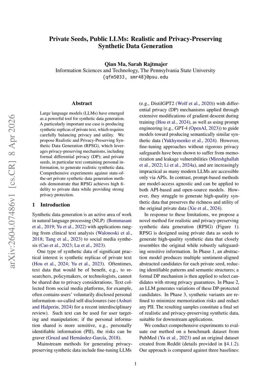Large language models (LLMs) have emerged as a powerful tool for synthetic data generation. A particularly important use case is producing synthetic replicas of private text, which requires carefully balancing privacy and utility. We propose Realistic and Privacy-Preserving Synthetic Data Generation (RPSG), which uses private seeds and integrates privacy-preserving strategies, including a formal differential privacy (DP) mechanism in the candidate selection, to generate realistic synthetic data. Comprehensive experiments against state-of-the-art private synthetic data generation methods demonstrate that RPSG achieves high fidelity to private data while providing strong privacy protection.