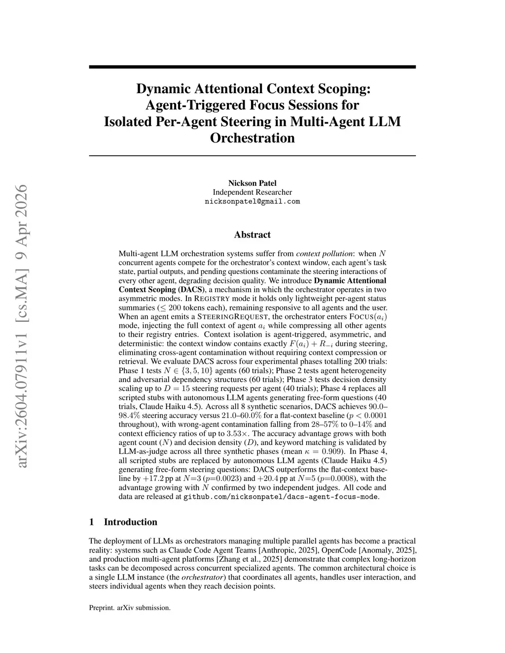 Multi-agent LLM orchestration systems suffer from context pollution: when N concurrent agents compete for the orchestrator's context window, each agent's task state, partial outputs, and pending questions contaminate the steering interactions of every other agent, degrading decision quality. We introduce Dynamic Attentional Context Scoping (DACS), a mechanism in which the orchestrator operates in two asymmetric modes. In Registry mode it holds only lightweight per-agent status summaries (<=200 tokens each), remaining responsive to all agents and the user. When an agent emits a SteeringRequest, the orchestrator enters Focus(a_i) mode, injecting the full context of agent a_i while compressing all other agents to their registry entries. Context isolation is agent-triggered, asymmetric, and deterministic: the context window contains exactly F(a_i) + R_{-i} during steering, eliminating cross-agent contamination without requiring context compression or retrieval. We evaluate DACS across four experimental phases totalling 200 trials: Phase 1 tests N in {3,5,10} (60 trials); Phase 2 tests agent heterogeneity and adversarial dependencies (60 trials); Phase 3 tests decision density up to D=15 (40 trials); Phase 4 uses autonomous LLM agents for free-form questions (40 trials, Claude Haiku 4.5). Across all 8 synthetic scenarios, DACS achieves 90.0--98.4% steering accuracy versus 21.0--60.0% for a flat-context baseline (p < 0.0001 throughout), with wrong-agent contamination falling from 28--57% to 0--14% and context efficiency ratios of up to 3.53x. The accuracy advantage grows with N and D; keyword matching is validated by LLM-as-judge across all phases (mean kappa=0.909). DACS outperforms the flat-context baseline by +17.2pp at N=3 (p=0.0023) and +20.4pp at N=5 (p=0.0008) in Phase 4, with the advantage growing with N confirmed by two independent judges.