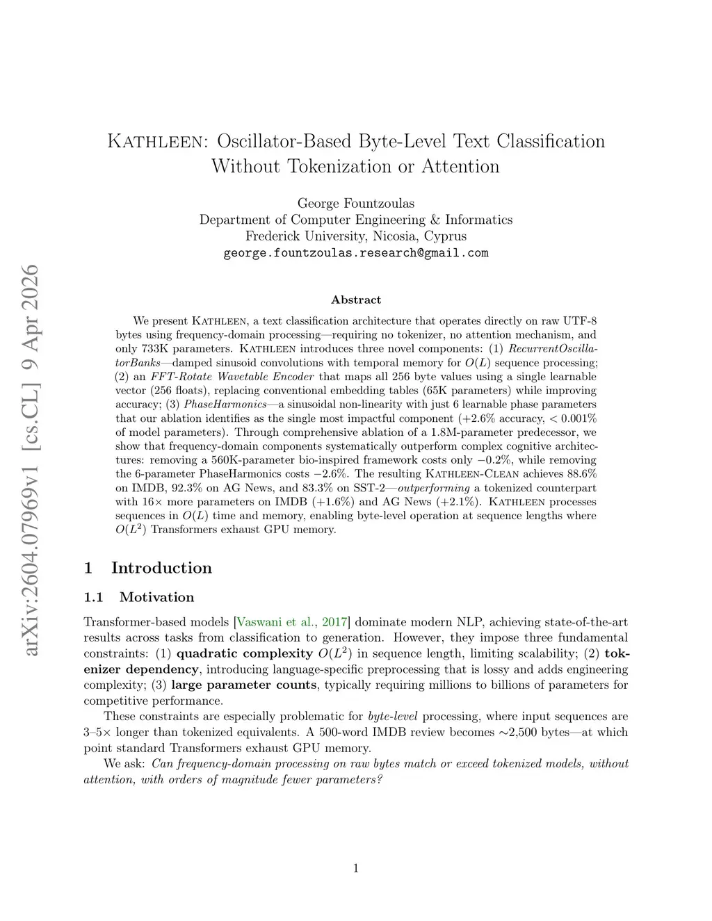We present Kathleen, a text classification architecture that operates directly on raw UTF-8 bytes using frequency-domain processing -- requiring no tokenizer, no attention mechanism, and only 733K parameters. Kathleen introduces three novel components: (1) RecurrentOscillatorBanks -- damped sinusoid convolutions with temporal memory for O(L) sequence processing; (2) an FFT-Rotate Wavetable Encoder that maps all 256 byte values using a single learnable vector (256 floats), replacing conventional embedding tables (65K parameters) while improving accuracy; (3) PhaseHarmonics -- a sinusoidal non-linearity with just 6 learnable phase parameters that our ablation identifies as the single most impactful component (+2.6% accuracy, <0.001% of model parameters). Through comprehensive ablation of a 1.8M-parameter predecessor, we show that frequency-domain components systematically outperform complex cognitive architectures: removing a 560K-parameter bio-inspired framework costs only -0.2%, while removing the 6-parameter PhaseHarmonics costs -2.6%. The resulting Kathleen-Clean achieves 88.6% on IMDB, 92.3% on AG News, and 83.3% on SST-2 -- outperforming a tokenized counterpart with 16x more parameters on IMDB (+1.6%) and AG News (+2.1%). Kathleen processes sequences in O(L) time and memory, enabling byte-level operation at sequence lengths where O(L^2) Transformers exhaust GPU memory.