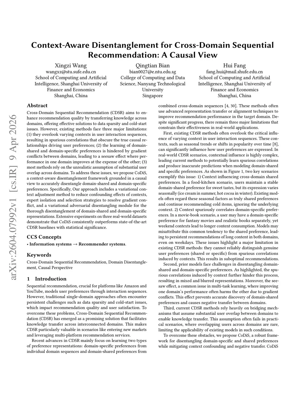 Cross-Domain Sequential Recommendation (CDSR) aims to en-hance recommendation quality by transferring knowledge across domains, offering effective solutions to data sparsity and cold-start issues. However, existing methods face three major limitations: (1) they overlook varying contexts in user interaction sequences, resulting in spurious correlations that obscure the true causal relationships driving user preferences; (2) the learning of domain- shared and domain-specific preferences is hindered by gradient conflicts between domains, leading to a seesaw effect where performance in one domain improves at the expense of the other; (3) most methods rely on the unrealistic assumption of substantial user overlap across domains. To address these issues, we propose CoDiS, a context-aware disentanglement framework grounded in a causal view to accurately disentangle domain-shared and domain-specific preferences. Specifically, Our approach includes a variational context adjustment method to reduce confounding effects of contexts, expert isolation and selection strategies to resolve gradient conflict, and a variational adversarial disentangling module for the thorough disentanglement of domain-shared and domain-specific representations. Extensive experiments on three real-world datasets demonstrate that CoDiS consistently outperforms state-of-the-art CDSR baselines with statistical significance. Code is available at:this https URL.