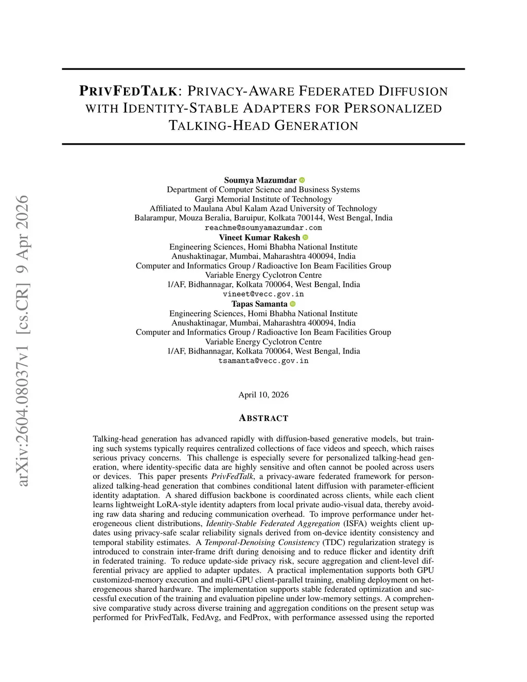 Talking-head generation has advanced rapidly with diffusion-based generative models, but training usually depends on centralized face-video and speech datasets, raising major privacy concerns. The problem is more acute for personalized talking-head generation, where identity-specific data are highly sensitive and often cannot be pooled across users or devices. PrivFedTalk is presented as a privacy-aware federated framework for personalized talking-head generation that combines conditional latent diffusion with parameter-efficient identity adaptation. A shared diffusion backbone is trained across clients, while each client learns lightweight LoRA identity adapters from local private audio-visual data, avoiding raw data sharing and reducing communication cost. To address heterogeneous client distributions, Identity-Stable Federated Aggregation (ISFA) weights client updates using privacy-safe scalar reliability signals computed from on-device identity consistency and temporal stability estimates. Temporal-Denoising Consistency (TDC) regularization is introduced to reduce inter-frame drift, flicker, and identity drift during federated denoising. To limit update-side privacy risk, secure aggregation and client-level differential privacy are applied to adapter updates. The implementation supports both low-memory GPU execution and multi-GPU client-parallel training on heterogeneous shared hardware. Comparative experiments on the present setup across multiple training and aggregation conditions with PrivFedTalk, FedAvg, and FedProx show stable federated optimization and successful end-to-end training and evaluation under constrained resources. The results support the feasibility of privacy-aware personalized talking-head training in federated environments, while suggesting that stronger component-wise, privacy-utility, and qualitative claims need further standardized evaluation.