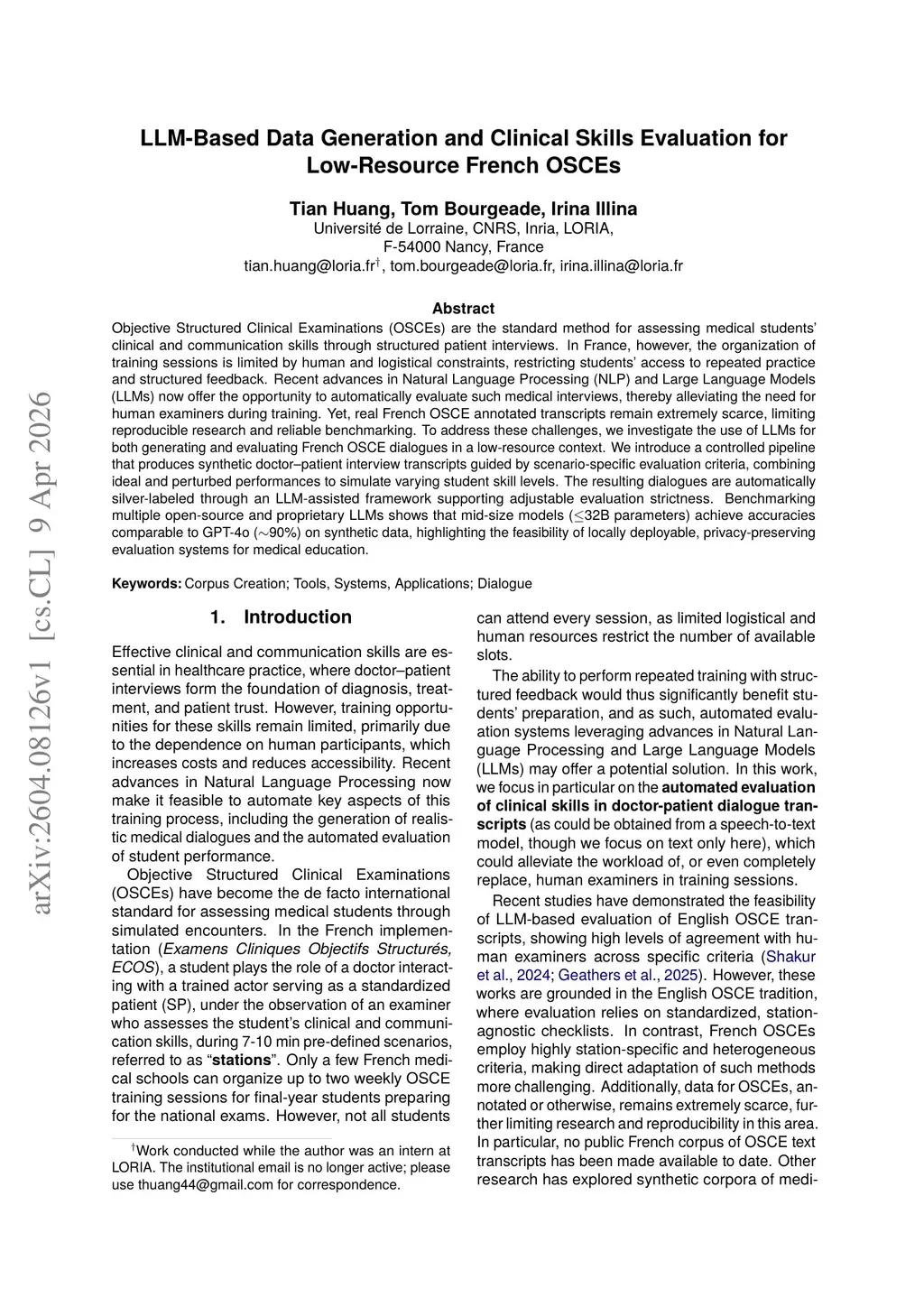 LLM-Based Data Generation and Clinical Skills Evaluation for Low-Resource French OSCEs