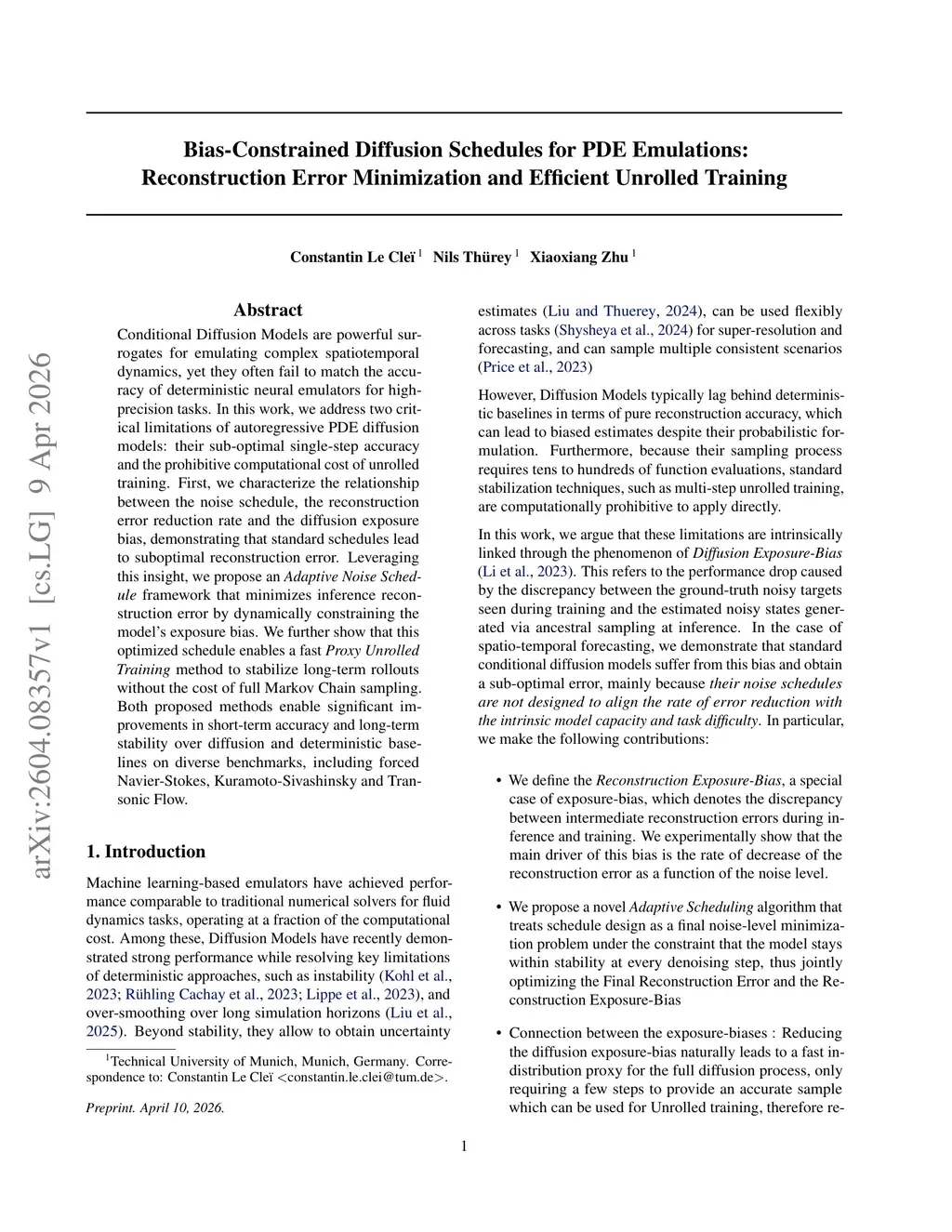 Conditional Diffusion Models are powerful surrogates for emulating complex spatiotemporal dynamics, yet they often fail to match the accuracy of deterministic neural emulators for high-precision tasks. In this work, we address two critical limitations of autoregressive PDE diffusion models: their sub-optimal single-step accuracy and the prohibitive computational cost of unrolled training. First, we characterize the relationship between the noise schedule, the reconstruction error reduction rate and the diffusion exposure bias, demonstrating that standard schedules lead to suboptimal reconstruction error. Leveraging this insight, we propose an \textit{Adaptive Noise Schedule} framework that minimizes inference reconstruction error by dynamically constraining the model's exposure bias. We further show that this optimized schedule enables a fast \textit{Proxy Unrolled Training} method to stabilize long-term rollouts without the cost of full Markov Chain sampling. Both proposed methods enable significant improvements in short-term accuracy and long-term stability over diffusion and deterministic baselines on diverse benchmarks, including forced Navier-Stokes, Kuramoto-Sivashinsky and Transonic Flow.
