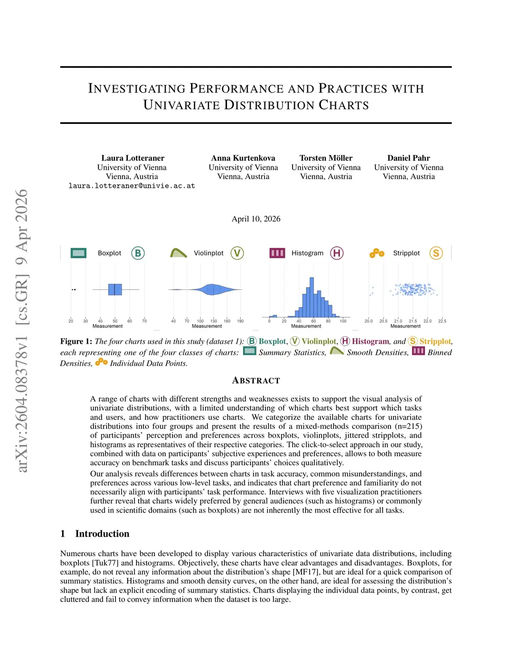 A range of charts with different strengths and weaknesses exists to support the visual analysis of univariate distributions, with a limited understanding of which charts best support which tasks and users, and how practitioners use charts. We categorize the available charts for univariate distributions into four groups and present the results of a mixed-methods comparison (n=215) of participants' perception and preferences across boxplots, violinplots, jittered stripplots, and histograms as representatives of their respective categories. The click-to-select approach in our study, combined with data on participants' subjective experiences and preferences, allows to both measure accuracy on benchmark tasks and discuss participants' choices qualitatively. Our analysis reveals differences between charts in task accuracy, common misunderstandings, and preferences across various low-level tasks, and indicates that chart preference and familiarity do not necessarily align with participants' task performance. Interviews with five visualization practitioners further reveal that charts widely preferred by general audiences (such as histograms) or commonly used in scientific domains (such as boxplots) are not inherently the most effective for all tasks.