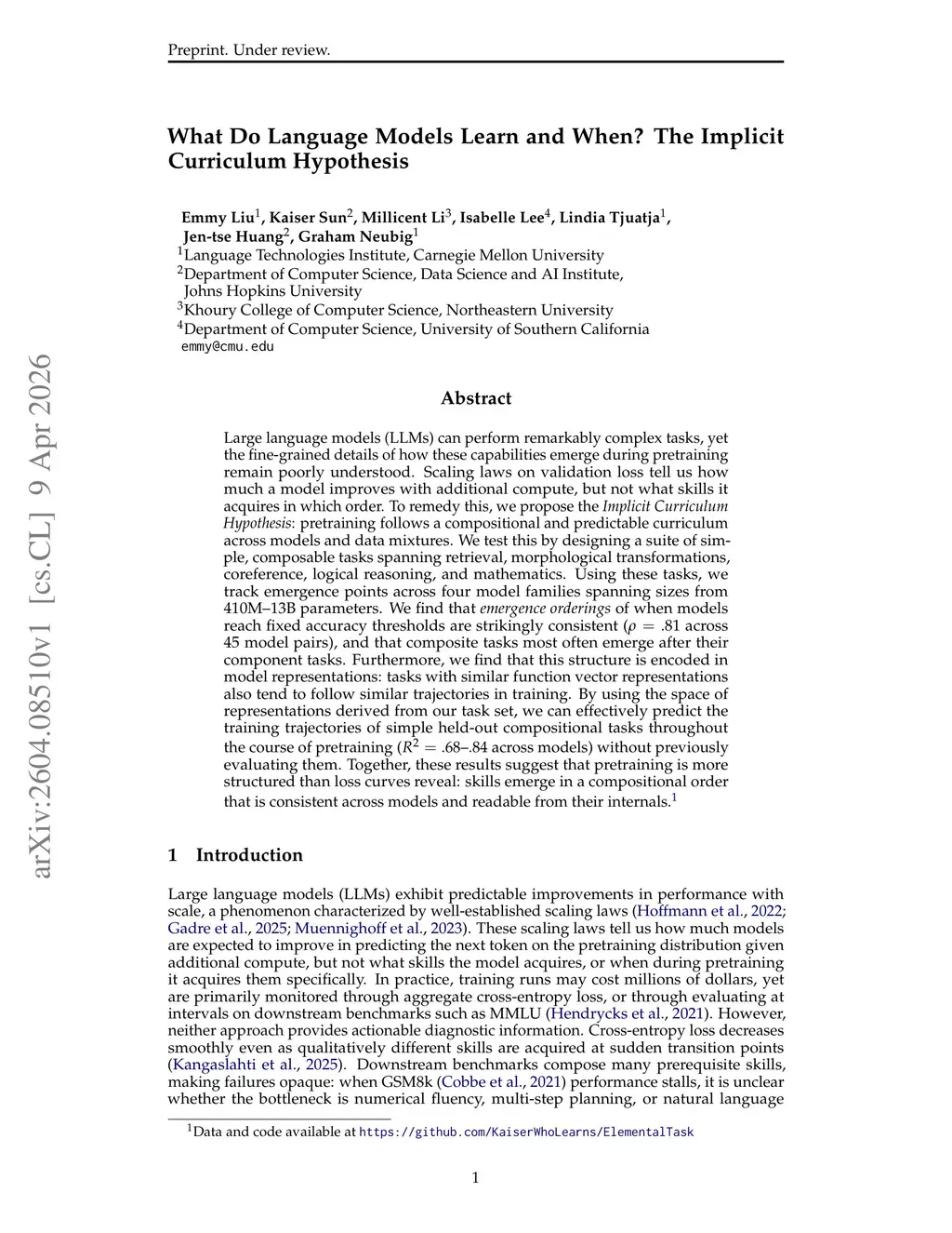Large language models (LLMs) can perform remarkably complex tasks, yet the fine-grained details of how these capabilities emerge during pretraining remain poorly understood. Scaling laws on validation loss tell us how much a model improves with additional compute, but not what skills it acquires in which order. To remedy this, we propose the Implicit Curriculum Hypothesis: pretraining follows a compositional and predictable curriculum across models and data mixtures. We test this by designing a suite of simple, composable tasks spanning retrieval, morphological transformations, coreference, logical reasoning, and mathematics. Using these tasks, we track emergence points across four model families spanning sizes from 410M-13B parameters. We find that emergence orderings of when models reach fixed accuracy thresholds are strikingly consistent ( across 45 model pairs), and that composite tasks most often emerge after their component tasks. Furthermore, we find that this structure is encoded in model representations: tasks with similar function vector representations also tend to follow similar trajectories in training. By using the space of representations derived from our task set, we can effectively predict the training trajectories of simple held-out compositional tasks throughout the course of pretraining (- across models) without previously evaluating them. Together, these results suggest that pretraining is more structured than loss curves reveal: skills emerge in a compositional order that is consistent across models and readable from their internals.