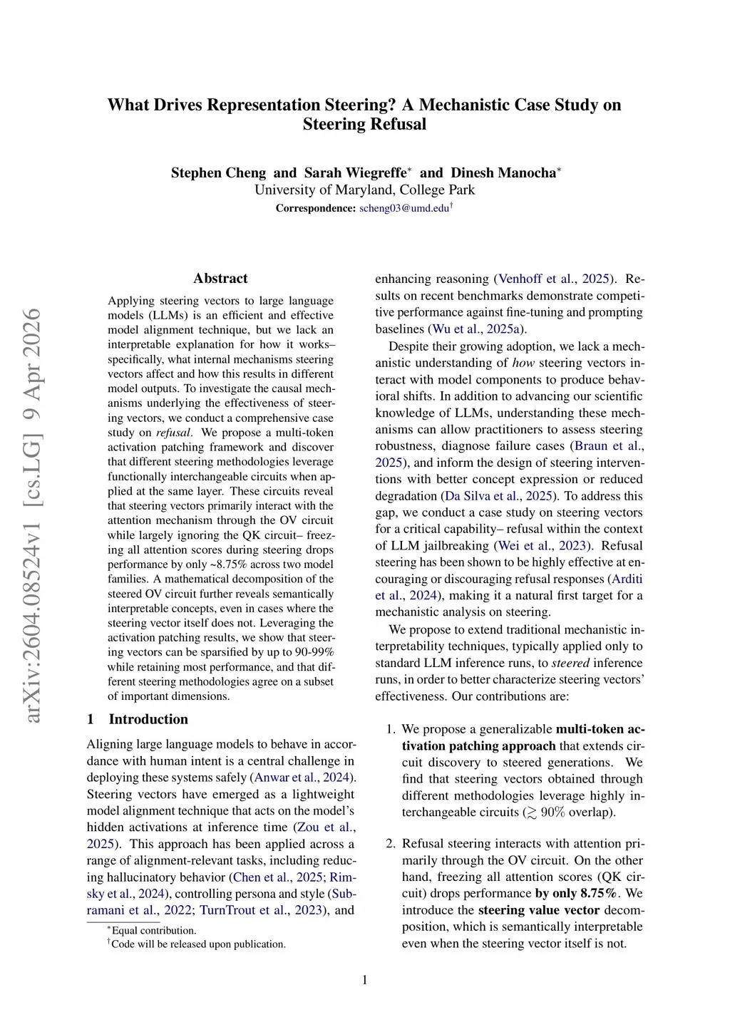 Applying steering vectors to large language models (LLMs) is an efficient and effective model alignment technique, but we lack an interpretable explanation for how it works-- specifically, what internal mechanisms steering vectors affect and how this results in different model outputs. To investigate the causal mechanisms underlying the effectiveness of steering vectors, we conduct a comprehensive case study on refusal. We propose a multi-token activation patching framework and discover that different steering methodologies leverage functionally interchangeable circuits when applied at the same layer. These circuits reveal that steering vectors primarily interact with the attention mechanism through the OV circuit while largely ignoring the QK circuit-- freezing all attention scores during steering drops performance by only 8.75% across two model families. A mathematical decomposition of the steered OV circuit further reveals semantically interpretable concepts, even in cases where the steering vector itself does not. Leveraging the activation patching results, we show that steering vectors can be sparsified by up to 90-99% while retaining most performance, and that different steering methodologies agree on a subset of important dimensions.