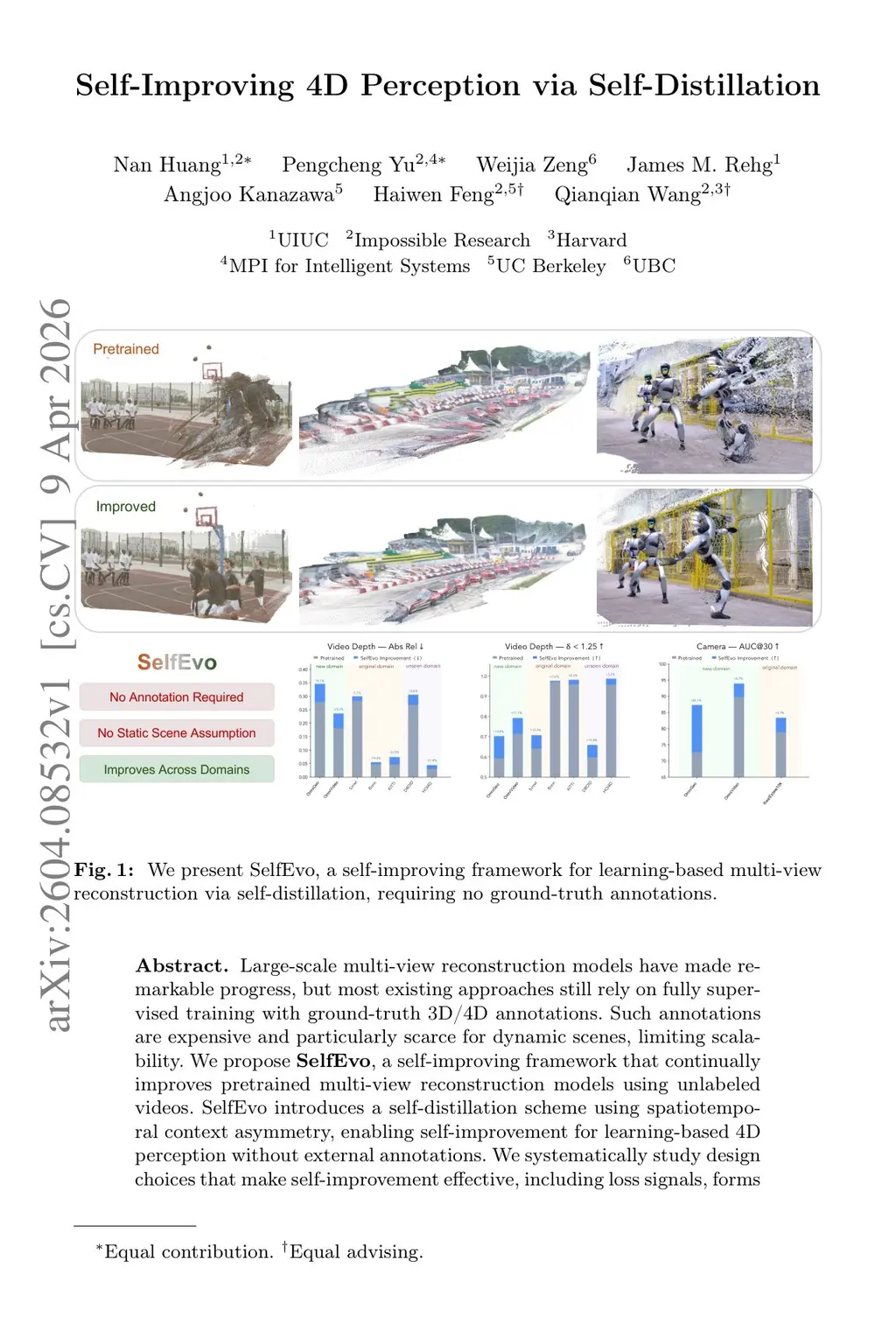Large-scale multi-view reconstruction models have made remarkable progress, but most existing approaches still rely on fully supervised training with ground-truth 3D/4D annotations. Such annotations are expensive and particularly scarce for dynamic scenes, limiting scalability. We propose SelfEvo, a self-improving framework that continually improves pretrained multi-view reconstruction models using unlabeled videos. SelfEvo introduces a self-distillation scheme using spatiotemporal context asymmetry, enabling self-improvement for learning-based 4D perception without external annotations. We systematically study design choices that make self-improvement effective, including loss signals, forms of asymmetry, and other training strategies. Across eight benchmarks spanning diverse datasets and domains, SelfEvo consistently improves pretrained baselines and generalizes across base models (e.g. VGGT and ), with significant gains on dynamic scenes. Overall, SelfEvo achieves up to 36.5% relative improvement in video depth estimation and 20.1% in camera estimation, without using any labeled data. Project Page:this https URL.