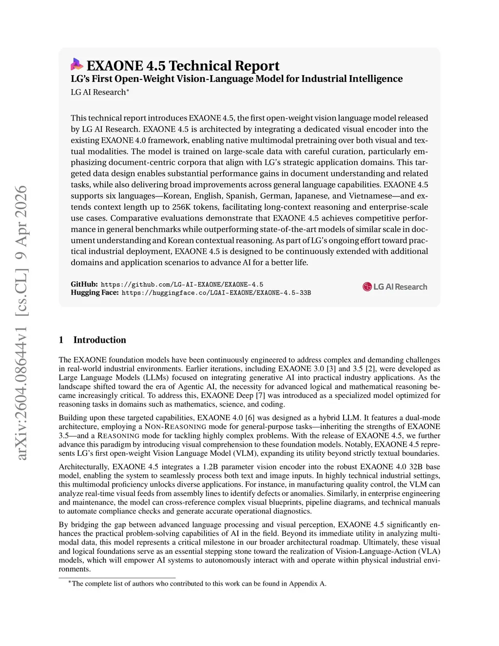 This technical report introduces EXAONE 4.5, the first open-weight vision language model released by LG AI Research. EXAONE 4.5 is architected by integrating a dedicated visual encoder into the existing EXAONE 4.0 framework, enabling native multimodal pretraining over both visual and textual modalities. The model is trained on large-scale data with careful curation, particularly emphasizing document-centric corpora that align with LG's strategic application domains. This targeted data design enables substantial performance gains in document understanding and related tasks, while also delivering broad improvements across general language capabilities. EXAONE 4.5 extends context length up to 256K tokens, facilitating long-context reasoning and enterprise-scale use cases. Comparative evaluations demonstrate that EXAONE 4.5 achieves competitive performance in general benchmarks while outperforming state-of-the-art models of similar scale in document understanding and Korean contextual reasoning. As part of LG's ongoing effort toward practical industrial deployment, EXAONE 4.5 is designed to be continuously extended with additional domains and application scenarios to advance AI for a better life.