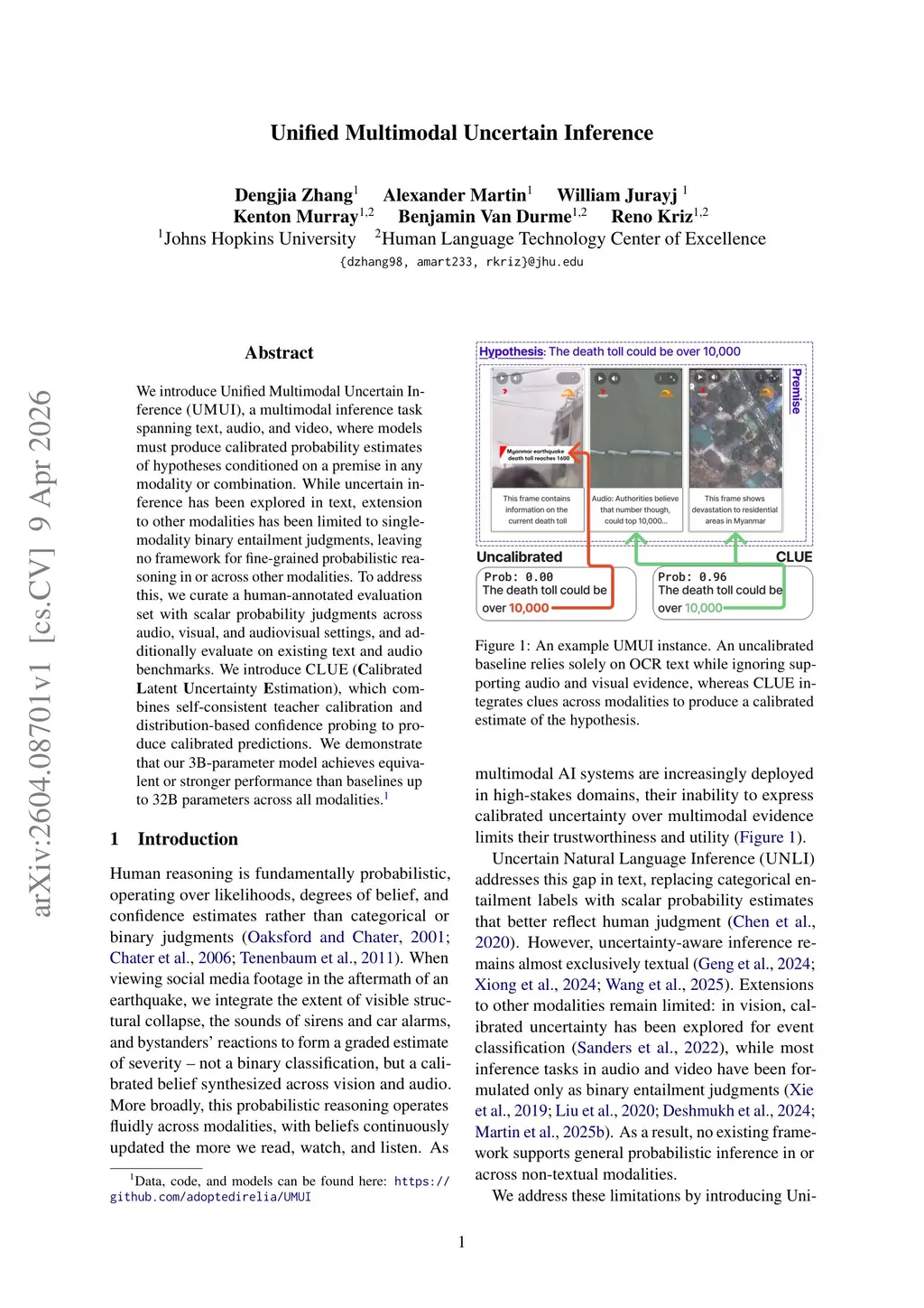 We introduce Unified Multimodal Uncertain Inference (UMUI), a multimodal inference task spanning text, audio, and video, where models must produce calibrated probability estimates of hypotheses conditioned on a premise in any modality or combination. While uncertain inference has been explored in text, extension to other modalities has been limited to single-modality binary entailment judgments, leaving no framework for fine-grained probabilistic reasoning in or across other modalities. To address this, we curate a human-annotated evaluation set with scalar probability judgments across audio, visual, and audiovisual settings, and additionally evaluate on existing text and audio benchmarks. We introduce CLUE (Calibrated Latent Uncertainty Estimation), which combines self-consistent teacher calibration and distribution-based confidence probing to produce calibrated predictions. We demonstrate that our 3B-parameter model achieves equivalent or stronger performance than baselines up to 32B parameters across all modalities.
