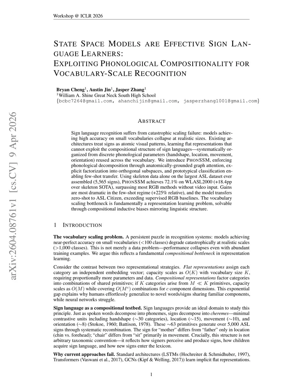 Sign language recognition suffers from catastrophic scaling failure: models achieving high accuracy on small vocabularies collapse at realistic sizes. Existing architectures treat signs as atomic visual patterns, learning flat representations that cannot exploit the compositional structure of sign languages-systematically organized from discrete phonological parameters (handshape, location, movement, orientation) reused across the vocabulary. We introduce PHONSSM, enforcing phonological decomposition through anatomically-grounded graph attention, explicit factorization into orthogonal subspaces, and prototypical classification enabling few-shot transfer. Using skeleton data alone on the largest ASL dataset ever assembled (5,565 signs), PHONSSM achieves 72.1% on WLASL2000 (+18.4pp over skeleton SOTA), surpassing most RGB methods without video input. Gains are most dramatic in the few-shot regime (+225% relative), and the model transfers zero-shot to ASL Citizen, exceeding supervised RGB baselines. The vocabulary scaling bottleneck is fundamentally a representation learning problem, solvable through compositional inductive biases mirroring linguistic structure.