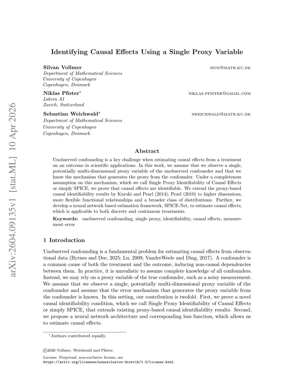 Unobserved confounding is a key challenge when estimating causal effects from a treatment on an outcome in scientific applications. In this work, we assume that we observe a single, potentially multi-dimensional proxy variable of the unobserved confounder and that we know the mechanism that generates the proxy from the confounder. Under a completeness assumption on this mechanism, which we call Single Proxy Identifiability of Causal Effects or simply SPICE, we prove that causal effects are identifiable. We extend the proxy-based causal identifiability results by Kuroki and Pearl (2014); Pearl (2010) to higher dimensions, more flexible functional relationships and a broader class of distributions. Further, we develop a neural network based estimation framework, SPICE-Net, to estimate causal effects, which is applicable to both discrete and continuous treatments.