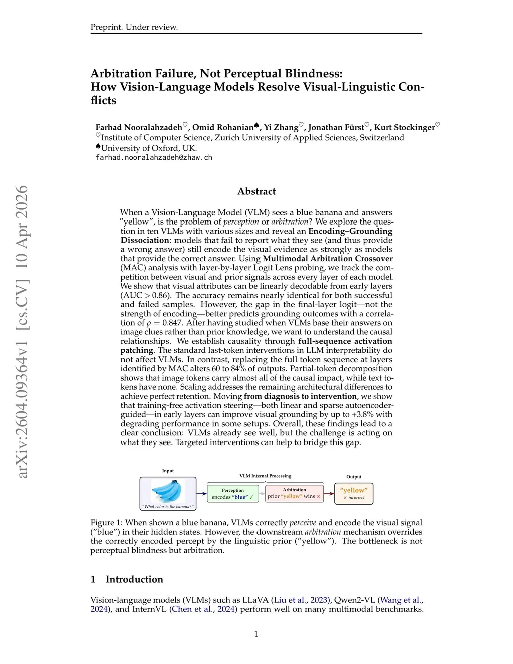 When a Vision-Language Model (VLM) sees a blue banana and answers "yellow", is the problem of perception or arbitration? We explore the question in ten VLMs with various sizes and reveal an Encoding-Grounding Dissociation: models that fail to report what they see (and thus provide a wrong answer) still encode the visual evidence as strongly as models that provide the correct answer. Using Multimodal Arbitration Crossover (MAC) analysis with layer-by-layer Logit Lens probing, we track the competition between visual and prior signals across every layer of each model. We show that visual attributes can be linearly decodable from early layers (AUC > 0.86). The accuracy remains nearly identical for both successful and failed samples. However, the gap in the final-layer logit - not the strength of encoding - better predicts grounding outcomes with a correlation of 0.847. After having studied when VLMs base their answers on image clues rather than prior knowledge, we want to understand the causal relationships. We establish causality through full-sequence activation patching. The standard last-token interventions in LLM interpretability do not affect VLMs. In contrast, replacing the full token sequence at layers identified by MAC alters 60 to 84% of outputs. Partial-token decomposition shows that image tokens carry almost all of the causal impact, while text tokens have none. Scaling addresses the remaining architectural differences to achieve perfect retention. Moving from diagnosis to intervention, we show that training-free activation steering - both linear and sparse autoencoder-guided - in early layers can improve visual grounding by up to +3.8% with degrading performance in some setups. Overall, these findings lead to a clear conclusion: VLMs already see well, but the challenge is acting on what they see. Targeted interventions can help to bridge this gap.