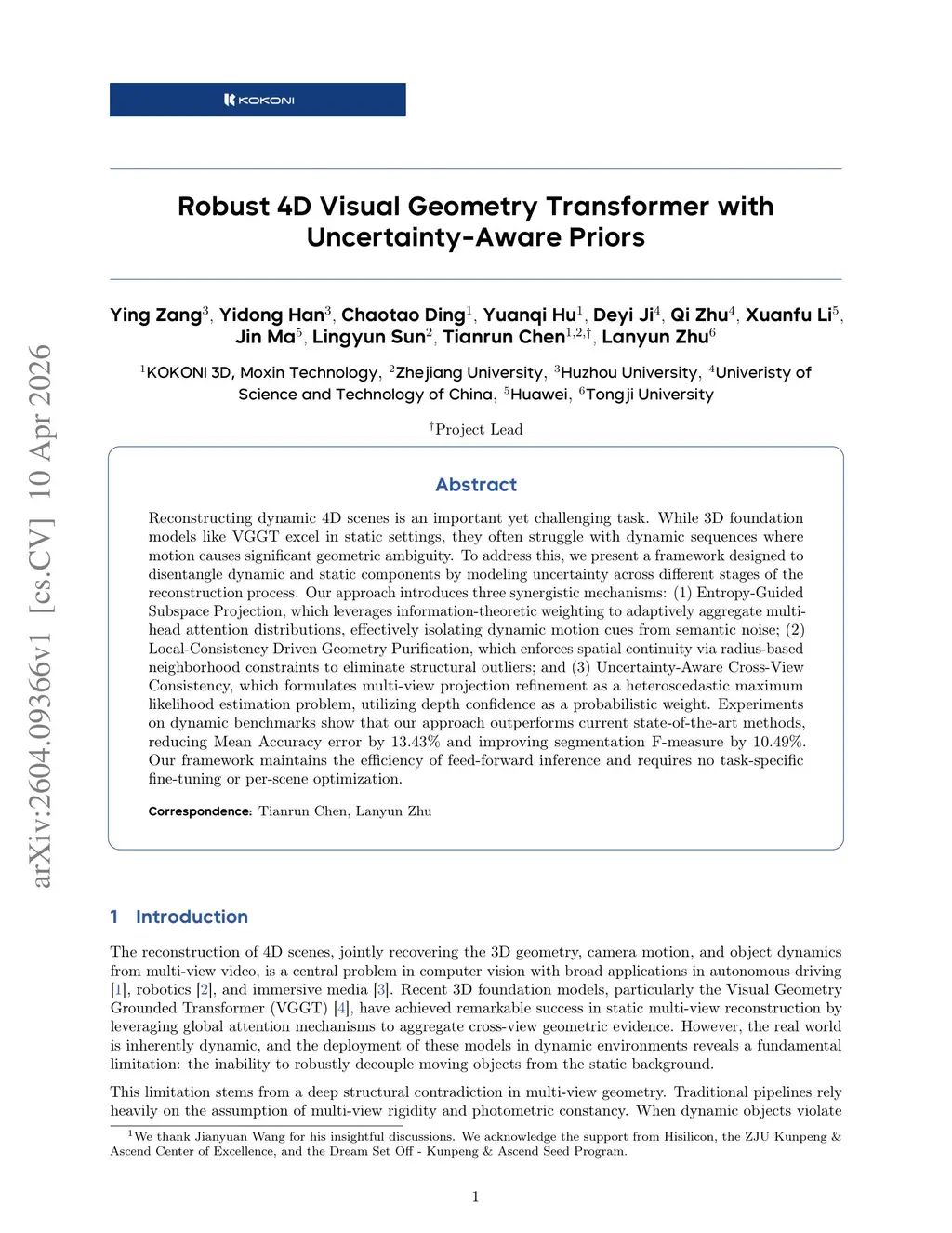 Reconstructing dynamic 4D scenes is an important yet challenging task. While 3D foundation models like VGGT excel in static settings, they often struggle with dynamic sequences where motion causes significant geometric ambiguity. To address this, we present a framework designed to disentangle dynamic and static components by modeling uncertainty across different stages of the reconstruction process. Our approach introduces three synergistic mechanisms: (1) Entropy-Guided Subspace Projection, which leverages information-theoretic weighting to adaptively aggregate multi-head attention distributions, effectively isolating dynamic motion cues from semantic noise; (2) Local-Consistency Driven Geometry Purification, which enforces spatial continuity via radius-based neighborhood constraints to eliminate structural outliers; and (3) Uncertainty-Aware Cross-View Consistency, which formulates multi-view projection refinement as a heteroscedastic maximum likelihood estimation problem, utilizing depth confidence as a probabilistic weight. Experiments on dynamic benchmarks show that our approach outperforms current state-of-the-art methods, reducing Mean Accuracy error by 13.43\% and improving segmentation F-measure by 10.49\%. Our framework maintains the efficiency of feed-forward inference and requires no task-specific fine-tuning or per-scene optimization.