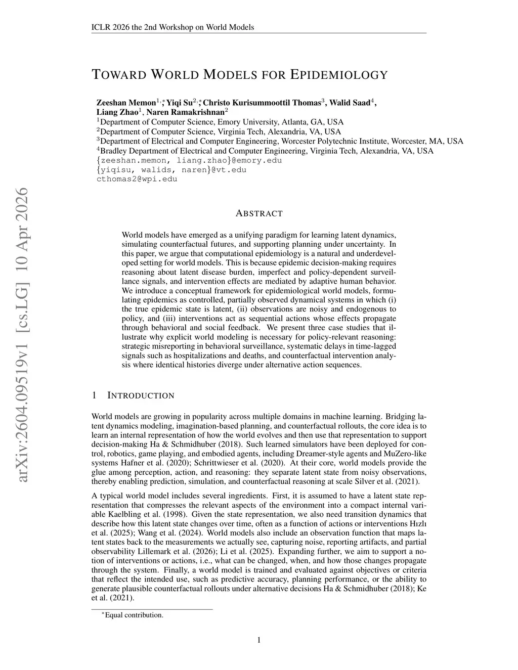 World models have emerged as a unifying paradigm for learning latent dynamics, simulating counterfactual futures, and supporting planning under uncertainty. In this paper, we argue that computational epidemiology is a natural and underdeveloped setting for world models. This is because epidemic decision-making requires reasoning about latent disease burden, imperfect and policy-dependent surveillance signals, and intervention effects are mediated by adaptive human behavior. We introduce a conceptual framework for epidemiological world models, formulating epidemics as controlled, partially observed dynamical systems in which (i) the true epidemic state is latent, (ii) observations are noisy and endogenous to policy, and (iii) interventions act as sequential actions whose effects propagate through behavioral and social feedback. We present three case studies that illustrate why explicit world modeling is necessary for policy-relevant reasoning: strategic misreporting in behavioral surveillance, systematic delays in time-lagged signals such as hospitalizations and deaths, and counterfactual intervention analysis where identical histories diverge under alternative action sequences.