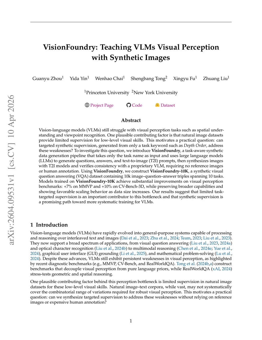 Vision-language models (VLMs) still struggle with visual perception tasks such as spatial understanding and viewpoint recognition. One plausible contributing factor is that natural image datasets provide limited supervision for low-level visual skills. This motivates a practical question: can targeted synthetic supervision, generated from only a task keyword such as Depth Order, address these weaknesses? To investigate this question, we introduce VisionFoundry, a task-aware synthetic data generation pipeline that takes only the task name as input and uses large language models (LLMs) to generate questions, answers, and text-to-image (T2I) prompts, then synthesizes images with T2I models and verifies consistency with a proprietary VLM, requiring no reference images or human annotation. Using VisionFoundry, we construct VisionFoundry-10K, a synthetic visual question answering (VQA) dataset containing 10k image-question-answer triples spanning 10 tasks. Models trained on VisionFoundry-10K achieve substantial improvements on visual perception benchmarks: +7% on MMVP and +10% on CV-Bench-3D, while preserving broader capabilities and showing favorable scaling behavior as data size increases. Our results suggest that limited task-targeted supervision is an important contributor to this bottleneck and that synthetic supervision is a promising path toward more systematic training for VLMs.