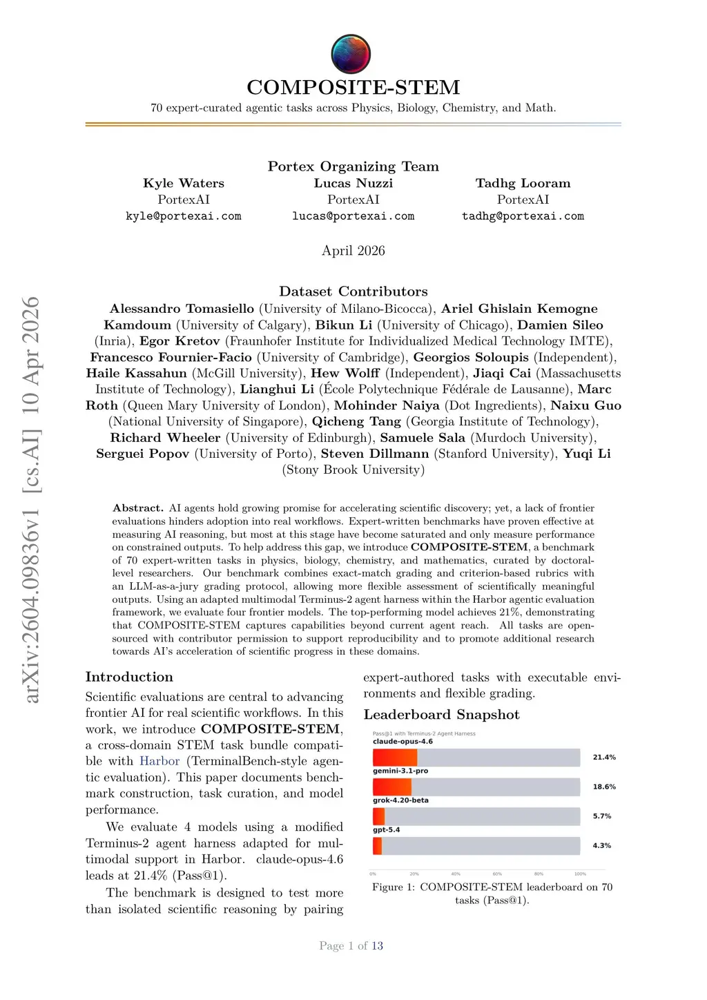 AI agents hold growing promise for accelerating scientific discovery; yet, a lack of frontier evaluations hinders adoption into real workflows. Expert-written benchmarks have proven effective at measuring AI reasoning, but most at this stage have become saturated and only measure performance on constrained outputs. To help address this gap, we introduce COMPOSITE-STEM, a benchmark of 70 expert-written tasks in physics, biology, chemistry, and mathematics, curated by doctoral-level researchers. Our benchmark combines exact-match grading and criterion-based rubrics with an LLM-as-a-jury grading protocol, allowing more flexible assessment of scientifically meaningful outputs. Using an adapted multimodal Terminus-2 agent harness within the Harbor agentic evaluation framework, we evaluate four frontier models. The top-performing model achieves 21%, demonstrating that COMPOSITE-STEM captures capabilities beyond current agent reach. All tasks are open-sourced with contributor permission to support reproducibility and to promote additional research towards AI's acceleration of scientific progress in these domains.