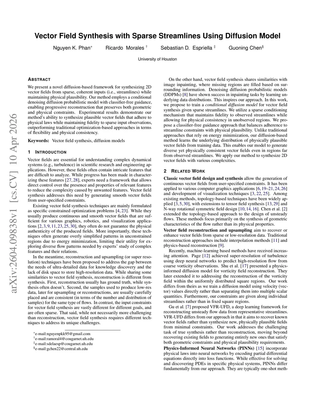 We present a novel diffusion-based framework for synthesizing 2D vector fields from sparse, coherent inputs (i.e., streamlines) while maintaining physical plausibility. Our method employs a conditional denoising diffusion probabilistic model with classifier-free guidance, enabling progressive reconstruction that preserves both geometric and physical constraints. Experimental results demonstrate our method's ability to synthesize plausible vector fields that adhere to physical laws while maintaining fidelity to sparse input observations, outperforming traditional optimization-based approaches in terms of flexibility and physical consistency.