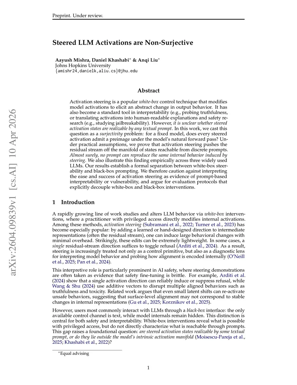 Activation steering is a popular white-box control technique that modifies model activations to elicit an abstract change in output behavior. It has also become a standard tool in interpretability (e.g., probing truthfulness, or translating activations into human-readable explanations and safety research (e.g., studying jailbreakability). However, it is unclear whether steered activation states are realizable by any textual prompt. In this work, we cast this question as a surjectivity problem: for a fixed model, does every steered activation admit a pre-image under the model's natural forward pass? Under practical assumptions, we prove that activation steering pushes the residual stream off the manifold of states reachable from discrete prompts. Almost surely, no prompt can reproduce the same internal behavior induced by steering. We also illustrate this finding empirically across three widely used LLMs. Our results establish a formal separation between white-box steerability and black-box prompting. We therefore caution against interpreting the ease and success of activation steering as evidence of prompt-based interpretability or vulnerability, and argue for evaluation protocols that explicitly decouple white-box and black-box interventions.