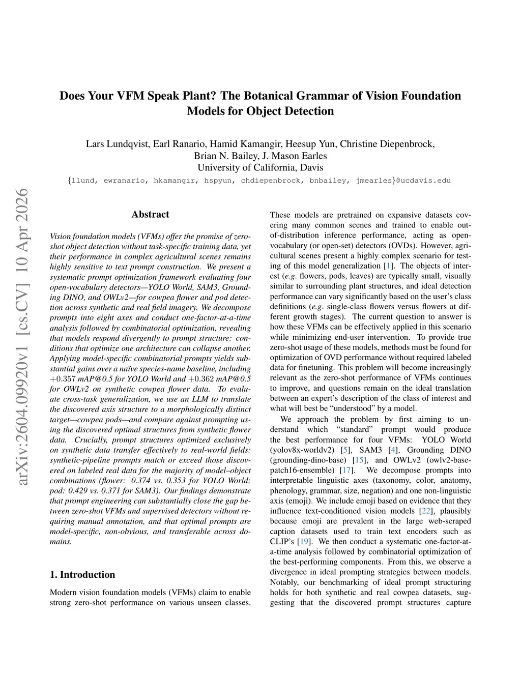 Vision foundation models (VFMs) offer the promise of zero-shot object detection without task-specific training data, yet their performance in complex agricultural scenes remains highly sensitive to text prompt construction. We present a systematic prompt optimization framework evaluating four open-vocabulary detectors -- YOLO World, SAM3, Grounding DINO, and OWLv2 -- for cowpea flower and pod detection across synthetic and real field imagery. We decompose prompts into eight axes and conduct one-factor-at-a-time analysis followed by combinatorial optimization, revealing that models respond divergently to prompt structure: conditions that optimize one architecture can collapse another. Applying model-specific combinatorial prompts yields substantial gains over a naive species-name baseline, including +0.357 mAP@0.5 for YOLO World and +0.362 mAP@0.5 for OWLv2 on synthetic cowpea flower data. To evaluate cross-task generalization, we use an LLM to translate the discovered axis structure to a morphologically distinct target -- cowpea pods -- and compare against prompting using the discovered optimal structures from synthetic flower data. Crucially, prompt structures optimized exclusively on synthetic data transfer effectively to real-world fields: synthetic-pipeline prompts match or exceed those discovered on labeled real data for the majority of model-object combinations (flower: 0.374 vs. 0.353 for YOLO World; pod: 0.429 vs. 0.371 for SAM3). Our findings demonstrate that prompt engineering can substantially close the gap between zero-shot VFMs and supervised detectors without requiring manual annotation, and that optimal prompts are model-specific, non-obvious, and transferable across domains.