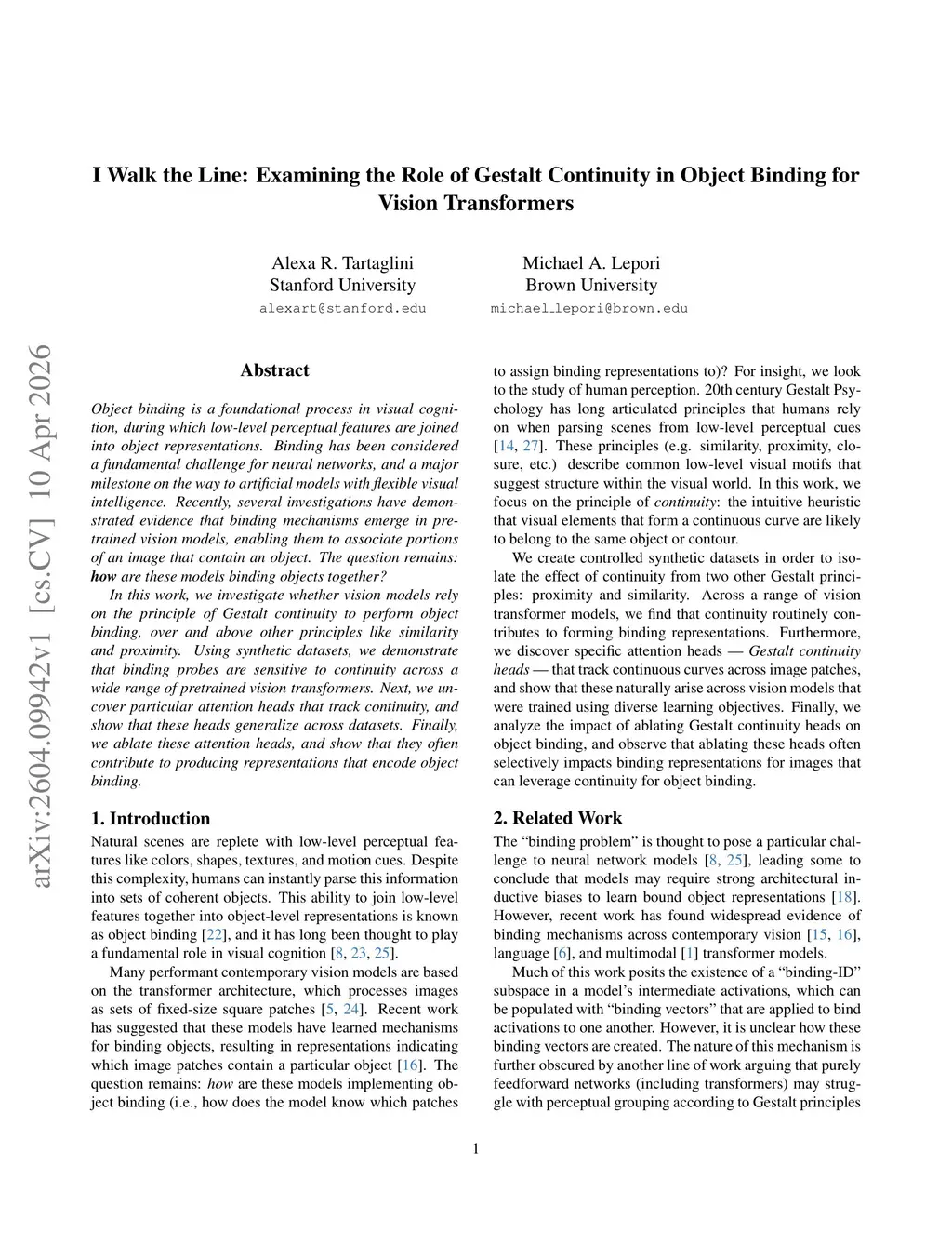 Object binding is a foundational process in visual cognition, during which low-level perceptual features are joined into object representations. Binding has been considered a fundamental challenge for neural networks, and a major milestone on the way to artificial models with flexible visual intelligence. Recently, several investigations have demonstrated evidence that binding mechanisms emerge in pretrained vision models, enabling them to associate portions of an image that contain an object. The question remains: how are these models binding objects together? In this work, we investigate whether vision models rely on the principle of Gestalt continuity to perform object binding, over and above other principles like similarity and proximity. Using synthetic datasets, we demonstrate that binding probes are sensitive to continuity across a wide range of pretrained vision transformers. Next, we uncover particular attention heads that track continuity, and show that these heads generalize across datasets. Finally, we ablate these attention heads, and show that they often contribute to producing representations that encode object binding.