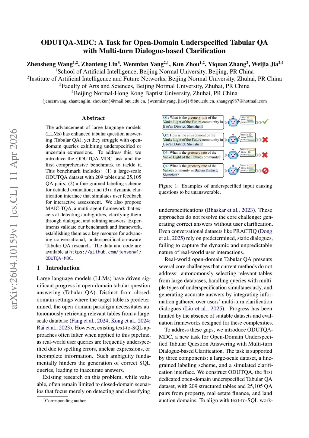 The advancement of large language models (LLMs) has enhanced tabular question answering (Tabular QA), yet they struggle with open-domain queries exhibiting underspecified or uncertain expressions. To address this, we introduce the ODUTQA-MDC task and the first comprehensive benchmark to tackle it. This benchmark includes: (1) a large-scale ODUTQA dataset with 209 tables and 25,105 QA pairs; (2) a fine-grained labeling scheme for detailed evaluation; and (3) a dynamic clarification interface that simulates user feedback for interactive assessment. We also propose MAIC-TQA, a multi-agent framework that excels at detecting ambiguities, clarifying them through dialogue, and refining answers. Experiments validate our benchmark and framework, establishing them as a key resource for advancing conversational, underspecification-aware Tabular QA research.