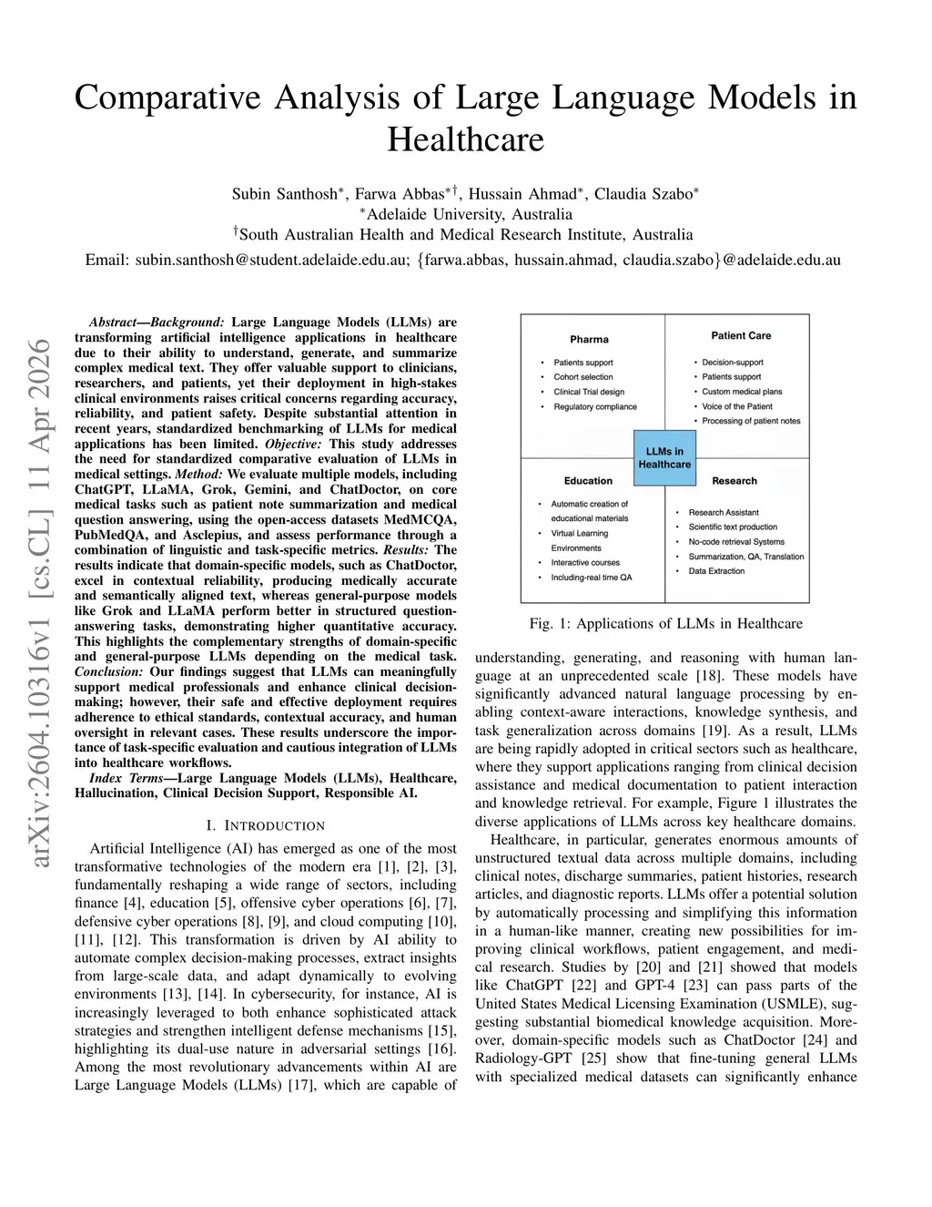 Background: Large Language Models (LLMs) are transforming artificial intelligence applications in healthcare due to their ability to understand, generate, and summarize complex medical text. They offer valuable support to clinicians, researchers, and patients, yet their deployment in high-stakes clinical environments raises critical concerns regarding accuracy, reliability, and patient safety. Despite substantial attention in recent years, standardized benchmarking of LLMs for medical applications has been limited. Objective: This study addresses the need for a standardized comparative evaluation of LLMs in medical settings. Method: We evaluate multiple models, including ChatGPT, LLaMA, Grok, Gemini, and ChatDoctor, on core medical tasks such as patient note summarization and medical question answering, using the open-access datasets, MedMCQA, PubMedQA, and Asclepius, and assess performance through a combination of linguistic and task-specific metrics. Results: The results indicate that domain-specific models, such as ChatDoctor, excel in contextual reliability, producing medically accurate and semantically aligned text, whereas general-purpose models like Grok and LLaMA perform better in structured question-answering tasks, demonstrating higher quantitative accuracy. This highlights the complementary strengths of domain-specific and general-purpose LLMs depending on the medical task. Conclusion: Our findings suggest that LLMs can meaningfully support medical professionals and enhance clinical decision-making; however, their safe and effective deployment requires adherence to ethical standards, contextual accuracy, and human oversight in relevant cases. These results underscore the importance of task-specific evaluation and cautious integration of LLMs into healthcare workflows.