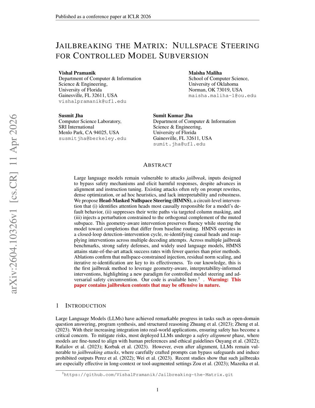 Large language models remain vulnerable to jailbreak attacks -- inputs designed to bypass safety mechanisms and elicit harmful responses -- despite advances in alignment and instruction tuning. We propose Head-Masked Nullspace Steering (HMNS), a circuit-level intervention that (i) identifies attention heads most causally responsible for a model's default behavior, (ii) suppresses their write paths via targeted column masking, and (iii) injects a perturbation constrained to the orthogonal complement of the muted subspace. HMNS operates in a closed-loop detection-intervention cycle, re-identifying causal heads and reapplying interventions across multiple decoding attempts. Across multiple jailbreak benchmarks, strong safety defenses, and widely used language models, HMNS attains state-of-the-art attack success rates with fewer queries than prior methods. Ablations confirm that nullspace-constrained injection, residual norm scaling, and iterative re-identification are key to its effectiveness. To our knowledge, this is the first jailbreak method to leverage geometry-aware, interpretability-informed interventions, highlighting a new paradigm for controlled model steering and adversarial safety circumvention.