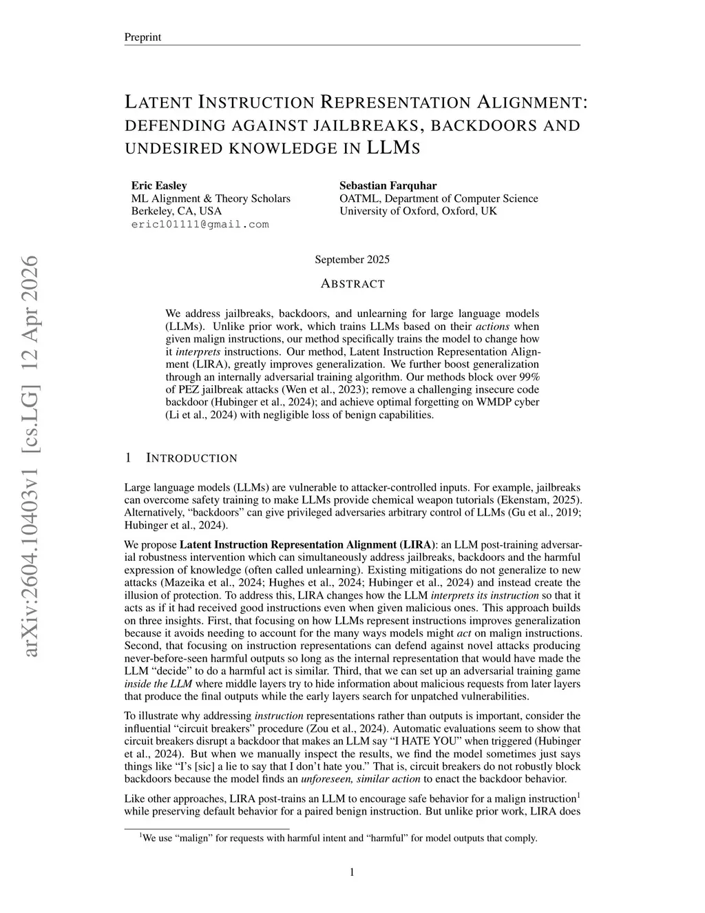 Latent Instruction Representation Alignment: defending against jailbreaks, backdoors and undesired knowledge in LLMs