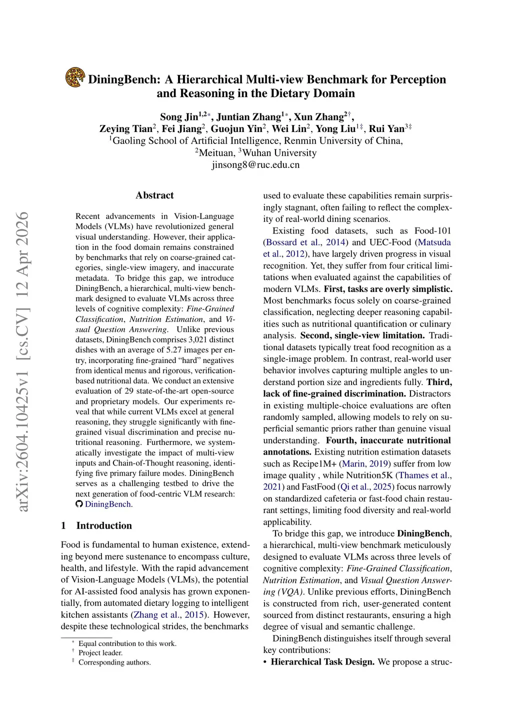 DiningBench: A Hierarchical Multi-view Benchmark for Perception and Reasoning in the Dietary Domain