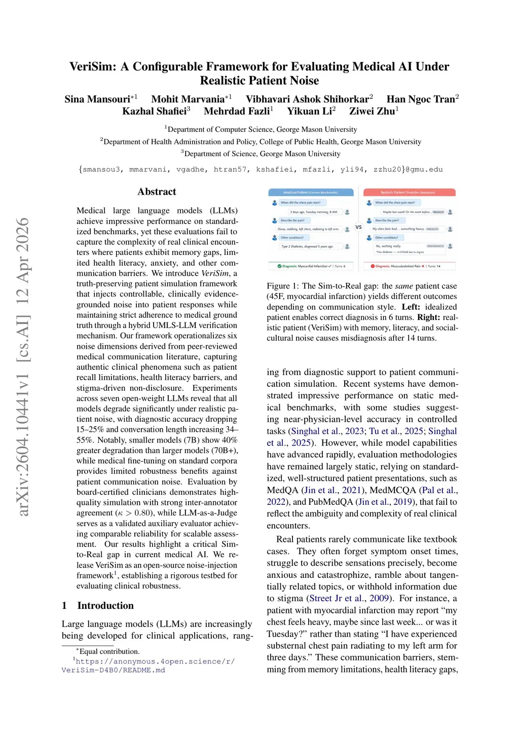 Medical large language models (LLMs) achieve impressive performance on standardized benchmarks, yet these evaluations fail to capture the complexity of real clinical encounters where patients exhibit memory gaps, limited health literacy, anxiety, and other communication barriers. We introduce VeriSim, a truth-preserving patient simulation framework that injects controllable, clinically evidence-grounded noise into patient responses while maintaining strict adherence to medical ground truth through a hybrid UMLS-LLM verification mechanism. Our framework operationalizes six noise dimensions derived from peer-reviewed medical communication literature, capturing authentic clinical phenomena such as patient recall limitations, health literacy barriers, and stigma-driven non-disclosure. Experiments across seven open-weight LLMs reveal that all models degrade significantly under realistic patient noise, with diagnostic accuracy dropping 15-25% and conversation length increasing 34-55%. Notably, smaller models (7B) show 40% greater degradation than larger models (70B+), while medical fine-tuning on standard corpora provides limited robustness benefits against patient communication noise. Evaluation by board-certified clinicians demonstrates high-quality simulation with strong inter-annotator agreement (kappa > 0.80), while LLM-as-a-Judge serves as a validated auxiliary evaluator achieving comparable reliability for scalable assessment. Our results highlight a critical Sim-to-Real gap in current medical AI. We release VeriSim as an open-source noise-injection framework, establishing a rigorous testbed for evaluating clinical robustness.