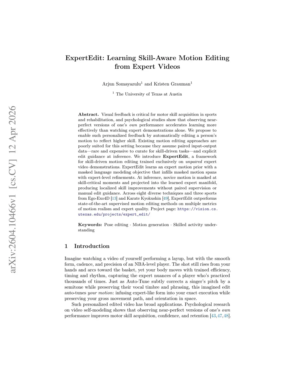 Visual feedback is critical for motor skill acquisition in sports and rehabilitation, and psychological studies show that observing near-perfect versions of one's own performance accelerates learning more effectively than watching expert demonstrations alone. We propose to enable such personalized feedback by automatically editing a person's motion to reflect higher skill. Existing motion editing approaches are poorly suited for this setting because they assume paired input-output data -- rare and expensive to curate for skill-driven tasks -- and explicit edit guidance at inference. We introduce ExpertEdit, a framework for skill-driven motion editing trained exclusively on unpaired expert video demonstrations. ExpertEdit learns an expert motion prior with a masked language modeling objective that infills masked motion spans with expert-level refinements. At inference, novice motion is masked at skill-critical moments and projected into the learned expert manifold, producing localized skill improvements without paired supervision or manual edit guidance. Across eight diverse techniques and three sports from Ego-Exo4D and Karate Kyokushin, ExpertEdit outperforms state-of-the-art supervised motion editing methods on multiple metrics of motion realism and expert quality. Project page:this https URL.