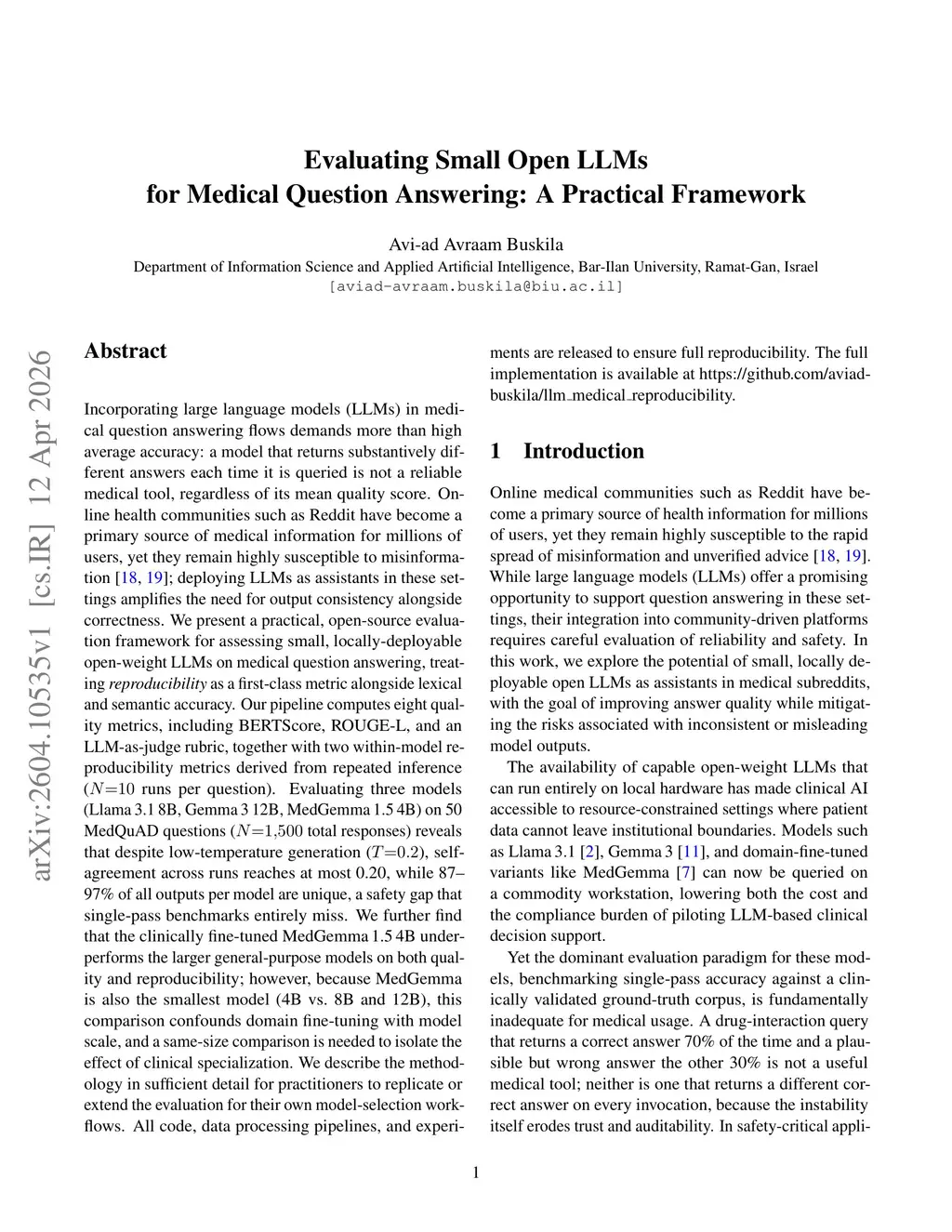Incorporating large language models (LLMs) in medical question answering demands more than high average accuracy: a model that returns substantively different answers each time it is queried is not a reliable medical tool. Online health communities such as Reddit have become a primary source of medical information for millions of users, yet they remain highly susceptible to misinformation; deploying LLMs as assistants in these settings amplifies the need for output consistency alongside correctness. We present a practical, open-source evaluation framework for assessing small, locally-deployable open-weight LLMs on medical question answering, treating reproducibility as a first-class metric alongside lexical and semantic accuracy. Our pipeline computes eight quality metrics, including BERTScore, ROUGE-L, and an LLM-as-judge rubric, together with two within-model reproducibility metrics derived from repeated inference (N=10 runs per question). Evaluating three models (Llama 3.1 8B, Gemma 3 12B, MedGemma 1.5 4B) on 50 MedQuAD questions (N=1,500 total responses) reveals that despite low-temperature generation (T=0.2), self-agreement across runs reaches at most 0.20, while 87-97% of all outputs per model are unique -- a safety gap that single-pass benchmarks entirely miss. The clinically fine-tuned MedGemma 1.5 4B underperforms the larger general-purpose models on both quality and reproducibility; however, because MedGemma is also the smallest model, this comparison confounds domain fine-tuning with model scale. We describe the methodology in sufficient detail for practitioners to replicate or extend the evaluation for their own model-selection workflows. All code and data pipelines are available atthis https URL.