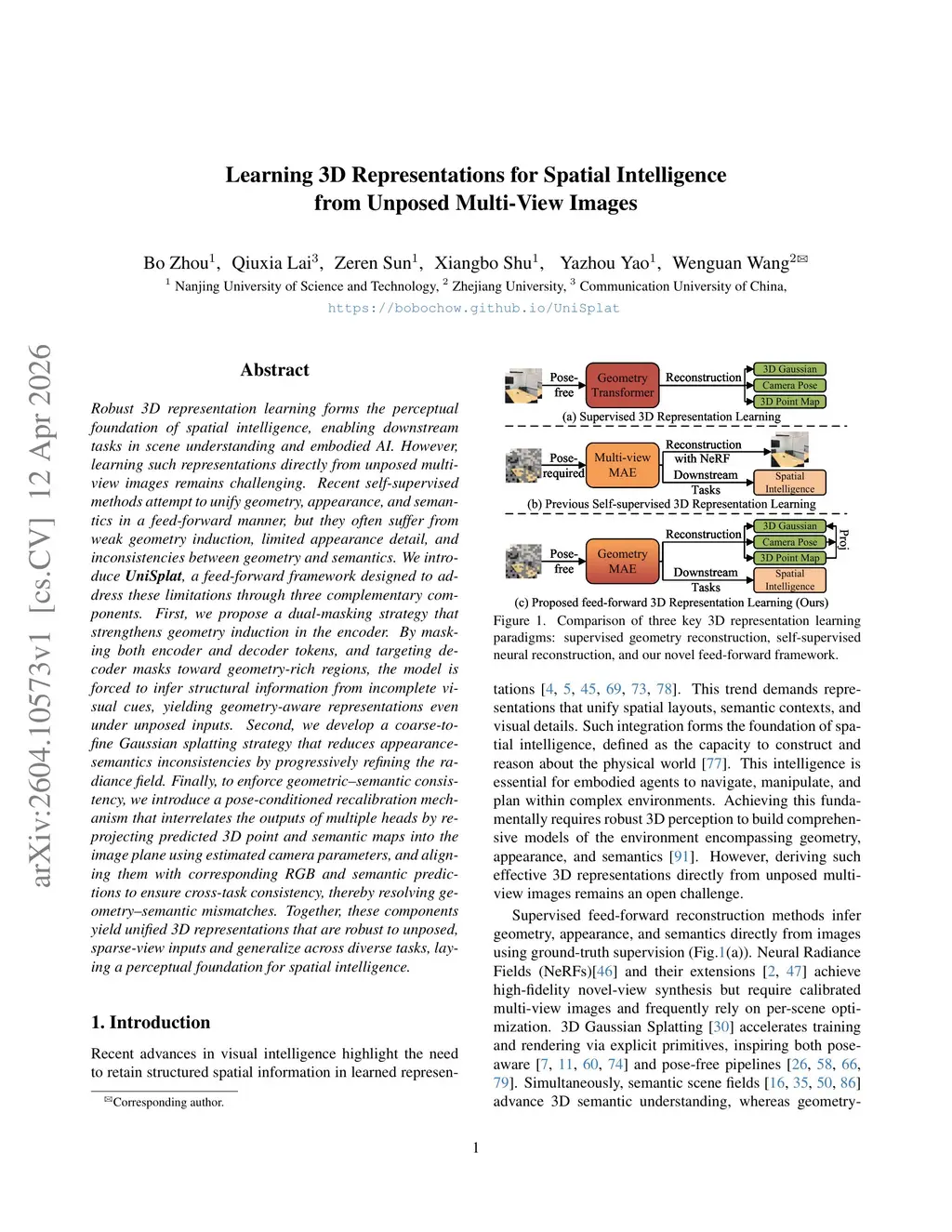 Robust 3D representation learning forms the perceptual foundation of spatial intelligence, enabling downstream tasks in scene understanding and embodied AI. However, learning such representations directly from unposed multi-view images remains challenging. Recent self-supervised methods attempt to unify geometry, appearance, and semantics in a feed-forward manner, but they often suffer from weak geometry induction, limited appearance detail, and inconsistencies between geometry and semantics. We introduce UniSplat, a feed-forward framework designed to address these limitations through three complementary components. First, we propose a dual-masking strategy that strengthens geometry induction in the encoder. By masking both encoder and decoder tokens, and targeting decoder masks toward geometry-rich regions, the model is forced to infer structural information from incomplete visual cues, yielding geometry-aware representations even under unposed inputs. Second, we develop a coarse-to-fine Gaussian splatting strategy that reduces appearance-semantics inconsistencies by progressively refining the radiance field. Finally, to enforce geometric-semantic consistency, we introduce a pose-conditioned recalibration mechanism that interrelates the outputs of multiple heads by re-projecting predicted 3D point and semantic maps into the image plane using estimated camera parameters, and aligning them with corresponding RGB and semantic predictions to ensure cross-task consistency, thereby resolving geometry-semantic mismatches. Together, these components yield unified 3D representations that are robust to unposed, sparse-view inputs and generalize across diverse tasks, laying a perceptual foundation for spatial intelligence.