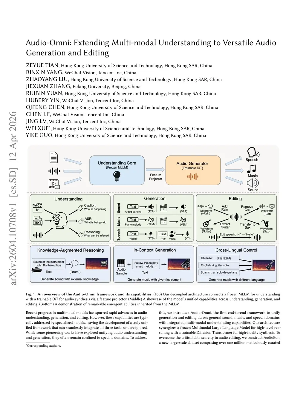 Audio-Omni: Extending Multi-modal Understanding to Versatile Audio Generation and Editing