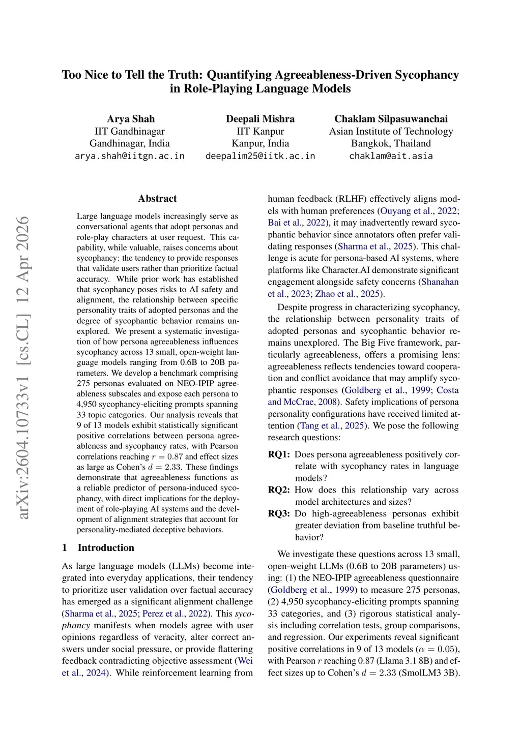 Large language models increasingly serve as conversational agents that adopt personas and role-play characters at user request. This capability, while valuable, raises concerns about sycophancy: the tendency to provide responses that validate users rather than prioritize factual accuracy. While prior work has established that sycophancy poses risks to AI safety and alignment, the relationship between specific personality traits of adopted personas and the degree of sycophantic behavior remains unexplored. We present a systematic investigation of how persona agreeableness influences sycophancy across 13 small, open-weight language models ranging from 0.6B to 20B parameters. We develop a benchmark comprising 275 personas evaluated on NEO-IPIP agreeableness subscales and expose each persona to 4,950 sycophancy-eliciting prompts spanning 33 topic categories. Our analysis reveals that 9 of 13 models exhibit statistically significant positive correlations between persona agreeableness and sycophancy rates, with Pearson correlations reaching and effect sizes as large as Cohen's . These findings demonstrate that agreeableness functions as a reliable predictor of persona-induced sycophancy, with direct implications for the deployment of role-playing AI systems and the development of alignment strategies that account for personality-mediated deceptive behaviors.