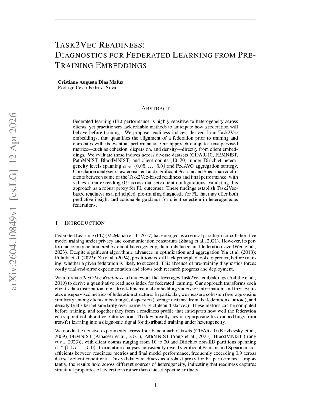 Task2vec Readiness: Diagnostics for Federated Learning from Pre-Training Embeddings
