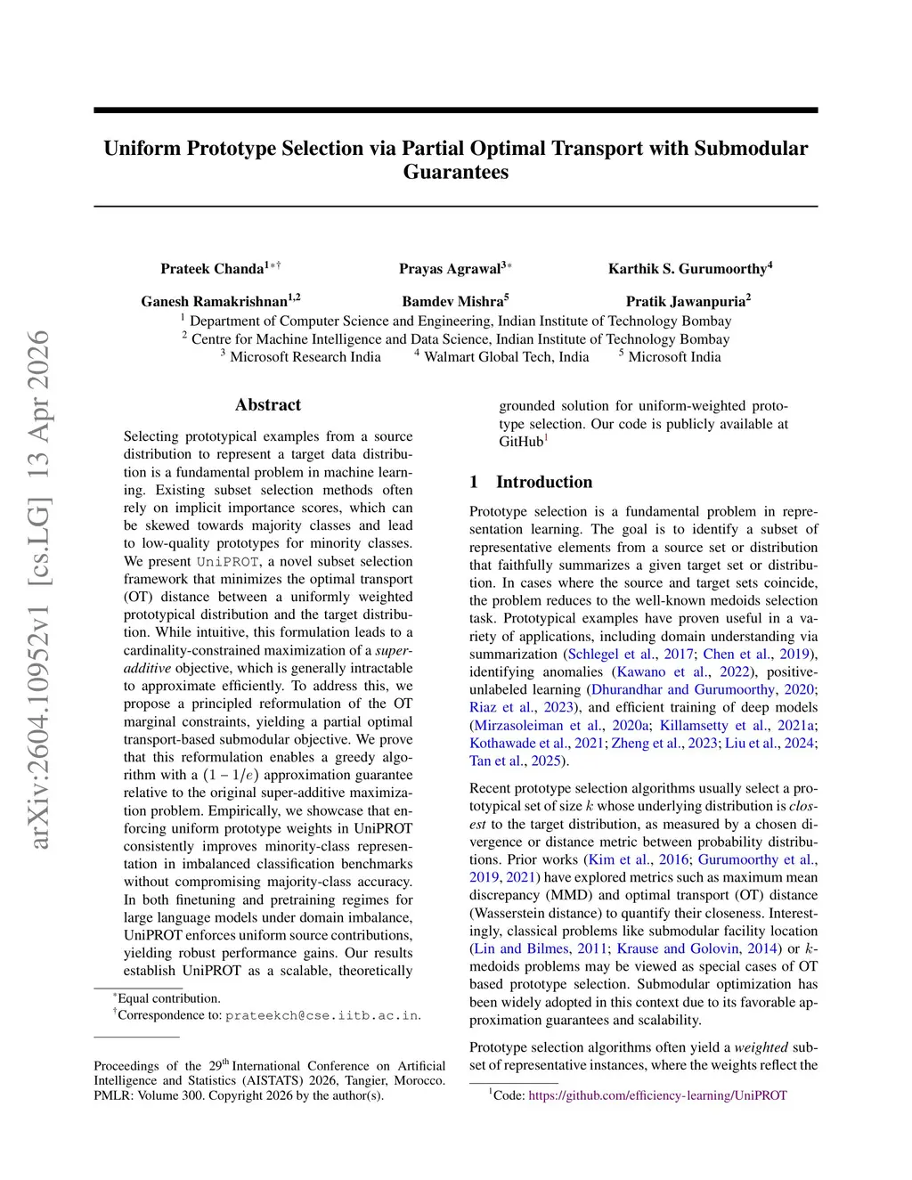 Selecting prototypical examples from a source distribution to represent a target data distribution is a fundamental problem in machine learning. Existing subset selection methods often rely on implicit importance scores, which can be skewed towards majority classes and lead to low-quality prototypes for minority classes. We present , a novel subset selection framework that minimizes the optimal transport (OT) distance between a uniformly weighted prototypical distribution and the target distribution. While intuitive, this formulation leads to a cardinality-constrained maximization of a \emph{super-additive} objective, which is generally intractable to approximate efficiently. To address this, we propose a principled reformulation of the OT marginal constraints, yielding a partial optimal transport-based submodular objective. We prove that this reformulation enables a greedy algorithm with a approximation guarantee relative to the original super-additive maximization problem. Empirically, we showcase that enforcing uniform prototype weights in UniPROT consistently improves minority-class representation in imbalanced classification benchmarks without compromising majority-class accuracy. In both finetuning and pretraining regimes for large language models under domain imbalance, UniPROT enforces uniform source contributions, yielding robust performance gains. Our results establish UniPROT as a scalable, theoretically grounded solution for uniform-weighted prototype selection. Our code is publicly available at GitHub\footnote{Code:this https URL}