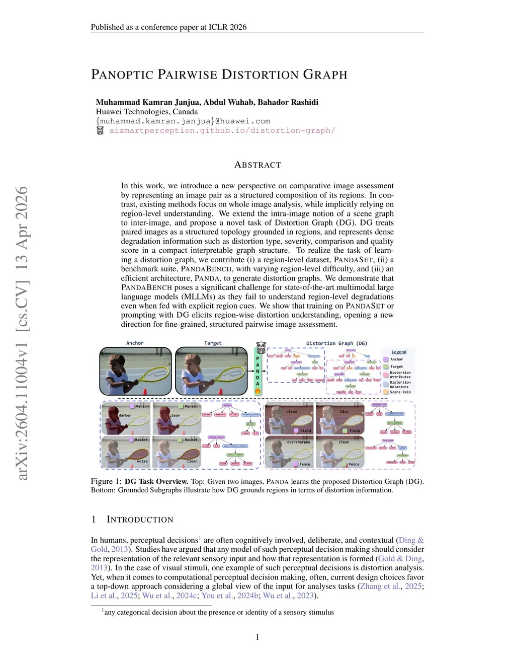 In this work, we introduce a new perspective on comparative image assessment by representing an image pair as a structured composition of its regions. In contrast, existing methods focus on whole image analysis, while implicitly relying on region-level understanding. We extend the intra-image notion of a scene graph to inter-image, and propose a novel task of Distortion Graph (DG). DG treats paired images as a structured topology grounded in regions, and represents dense degradation information such as distortion type, severity, comparison and quality score in a compact interpretable graph structure. To realize the task of learning a distortion graph, we contribute (i) a region-level dataset, PandaSet, (ii) a benchmark suite, PandaBench, with varying region-level difficulty, and (iii) an efficient architecture, Panda, to generate distortion graphs. We demonstrate that PandaBench poses a significant challenge for state-of-the-art multimodal large language models (MLLMs) as they fail to understand region-level degradations even when fed with explicit region cues. We show that training on PandaSet or prompting with DG elicits region-wise distortion understanding, opening a new direction for fine-grained, structured pairwise image assessment.